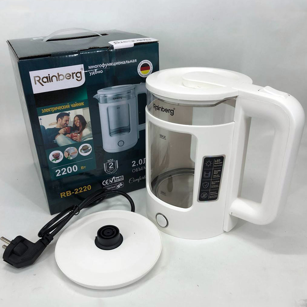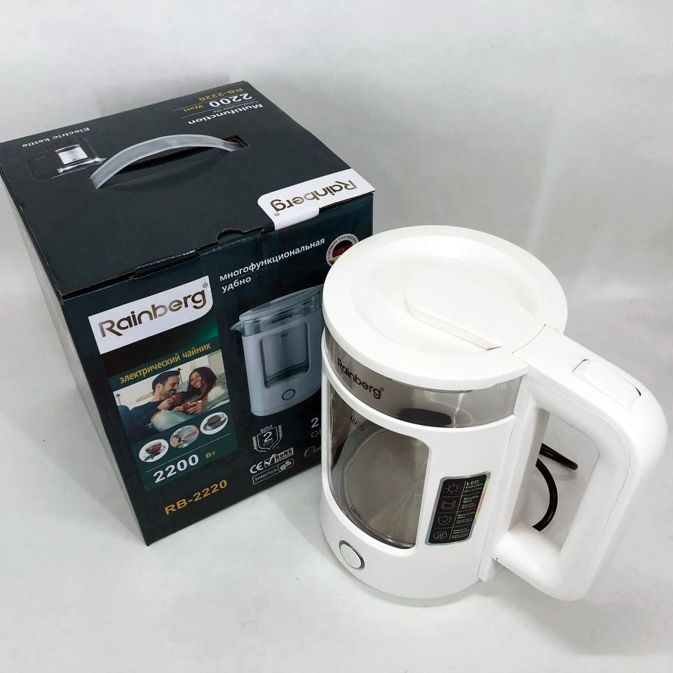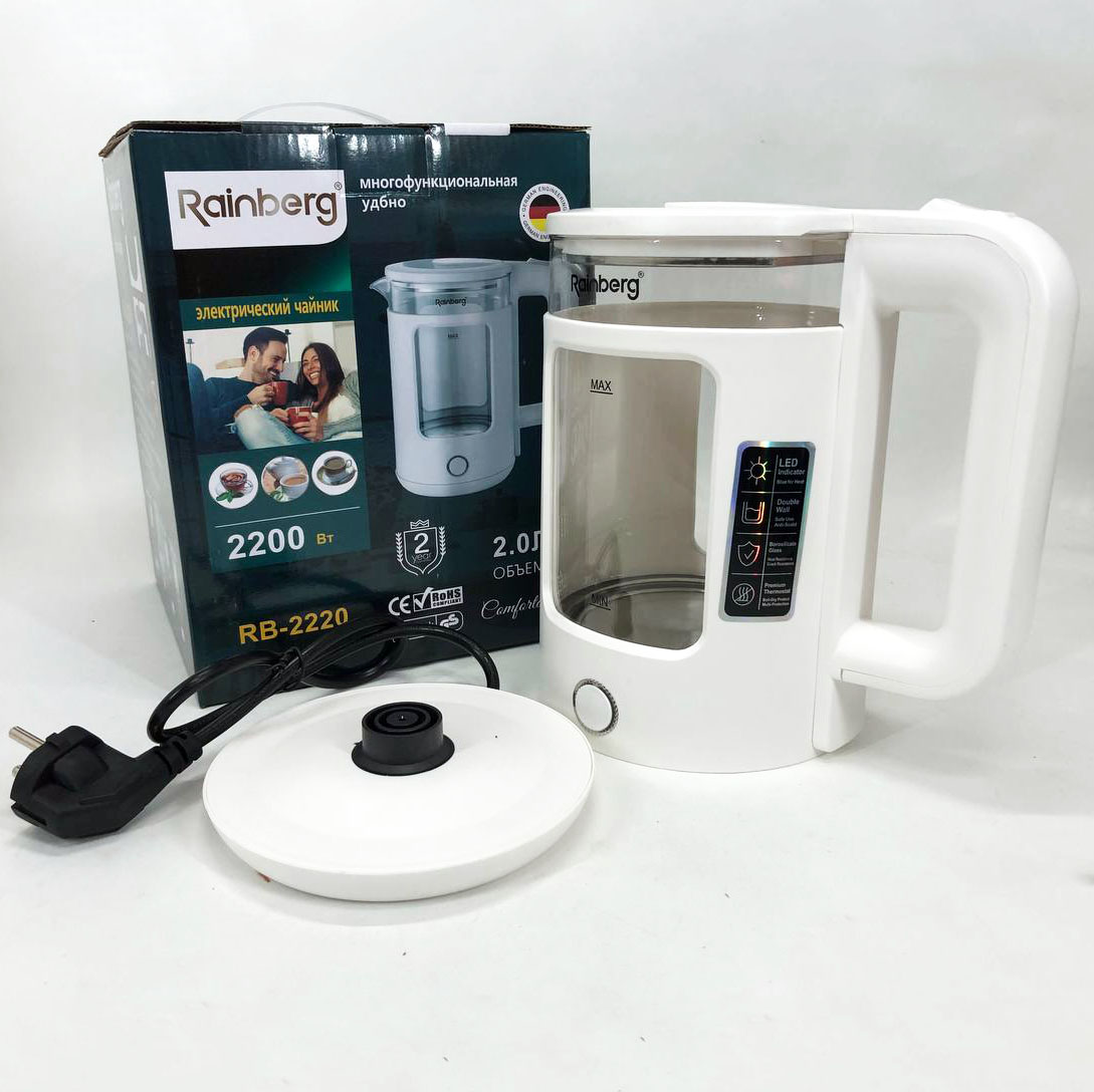 Электрочайник Rainberg RB-2220 стеклянный, дисковый прозрачный. Чайник с подсветкой 2200 Вт. Цвет: белый