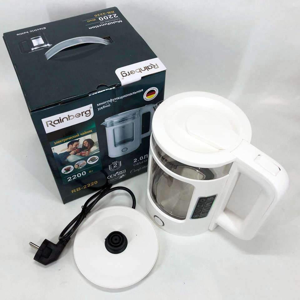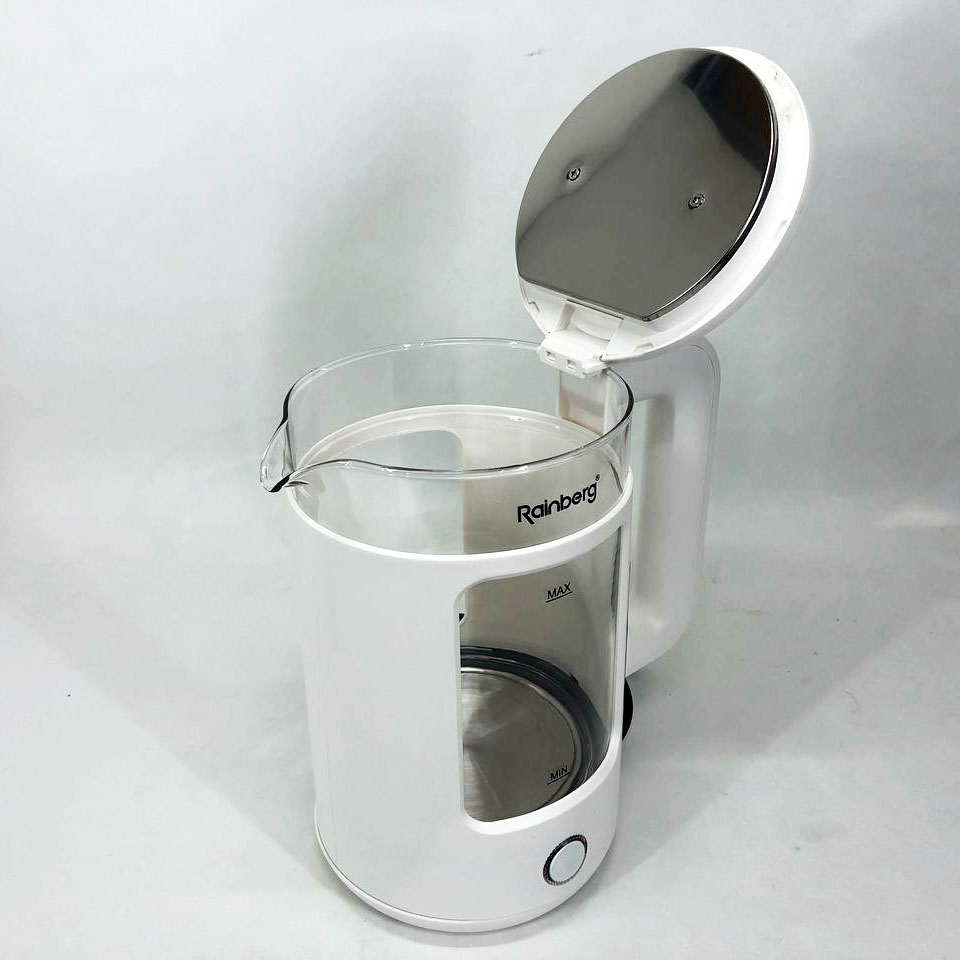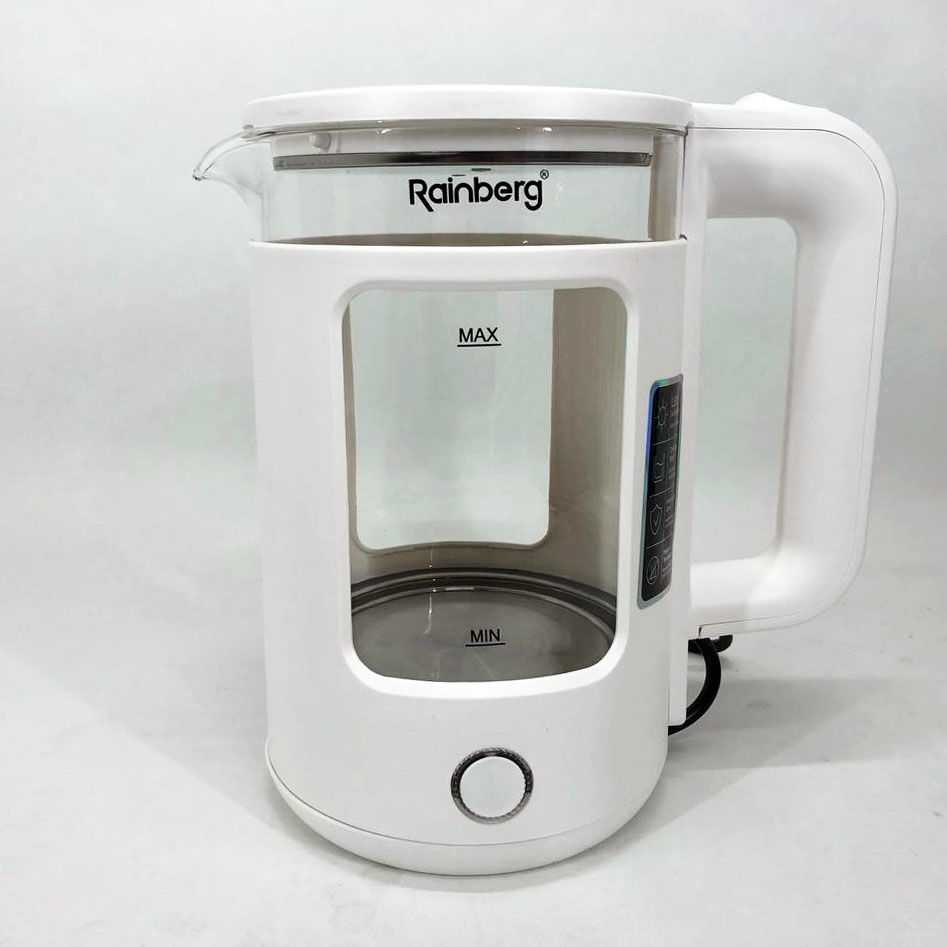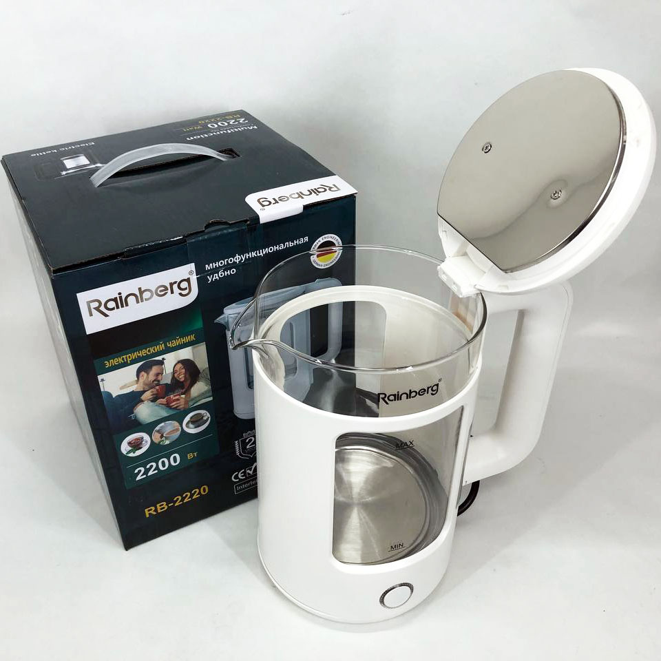 Электрочайник Rainberg RB-2220 стеклянный, дисковый прозрачный. Чайник с подсветкой 2200 Вт. Цвет: белый
