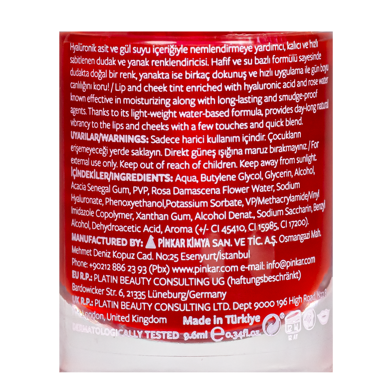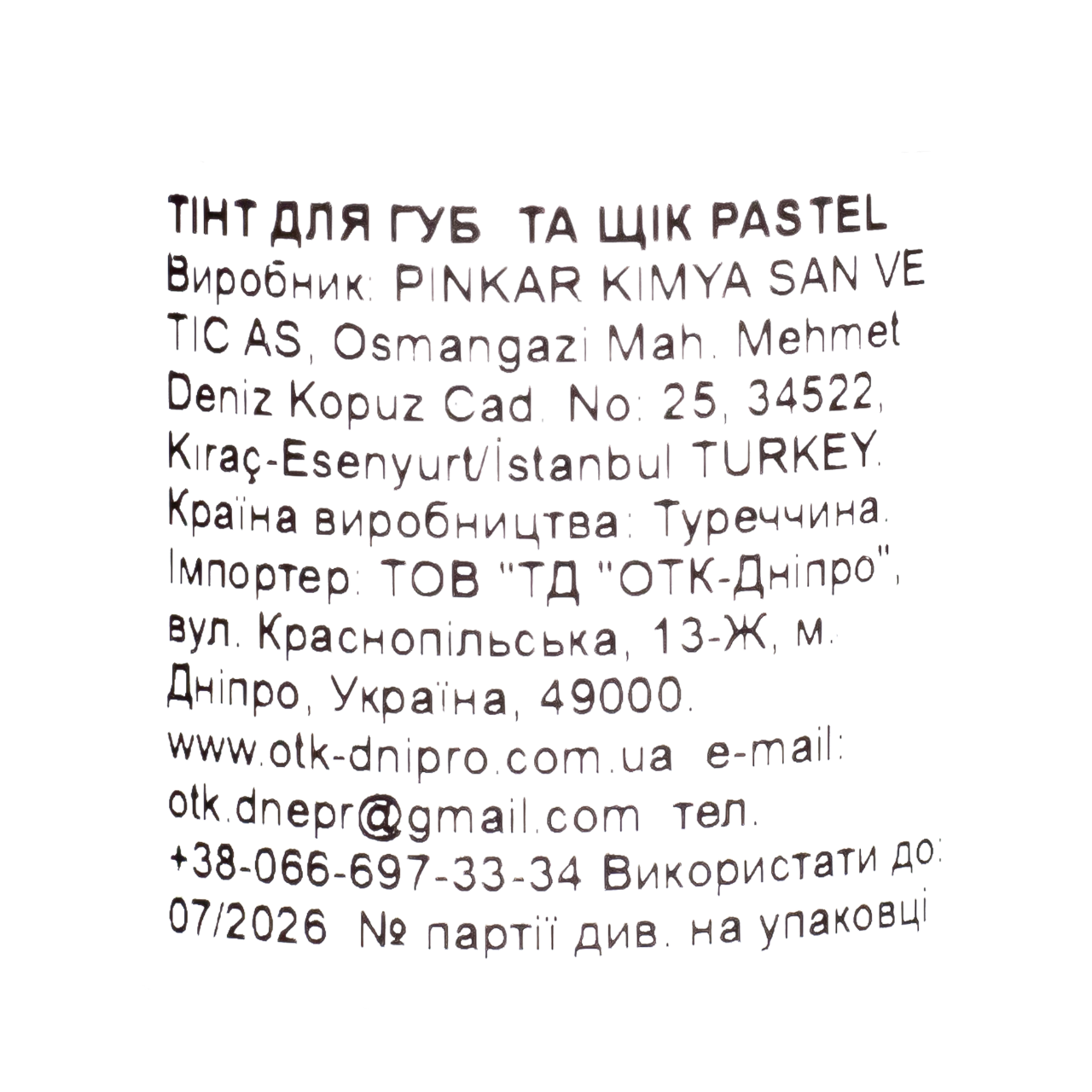 Тинт для губ і щік з гіалуроновою кислотою та рожевою водою Pastel Lip to Chic TintБажаєте, щоб макіяж виглядав максимально натурально, без ефекту «маски»? Вам допоможе тинт для губ та щік Pastel Lip to Chic Tint! Він не тільки надасть більш яскравого натурального відтінку шкіри, але й подбає про неї!Тинт має желеутворювальну та плівкоутворювальну основу. Завдяки цьому пігмент довго зберігається на шкірі. Після нанесення ще деякий час ви відчуватимете легкий малиновий аромат. Рум'яна не залишають після себе відчуття липкості чи жирності.До складу Pastel Lip to Chic Tint входять зволожувальні компоненти:гіалуронова кислота - зволожує, утримує вологу в шкірі; рожева вода - пом'якшує шкірний покрив, усуває запалення та подразнення.З тинтом для губ Pastel Lip to Chic Tint ваш макіяж завжди виглядатиме природним, як чиста шкіра. Подаруйте собі ще свіжіший і досконаліший колір обличчя та губ!У колекції представлено кілька відтінків:01 Carmen - вишнево-червоний; 02 Lolita - кораловий.Спосіб застосування: Нанесіть на шкіру губ і щік необхідну кількість тинту. Дайте засобу вбратися кілька хвилин.