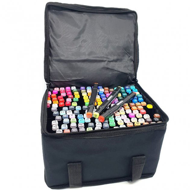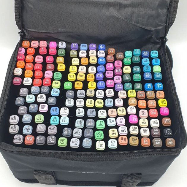 В наборе 80 маркеров разных цветов. Корпус пластиковый, гладкий. Колпачки плотно закрываются. Для удобства распознавания типа пера концы маркеров окрашены разным цветом.