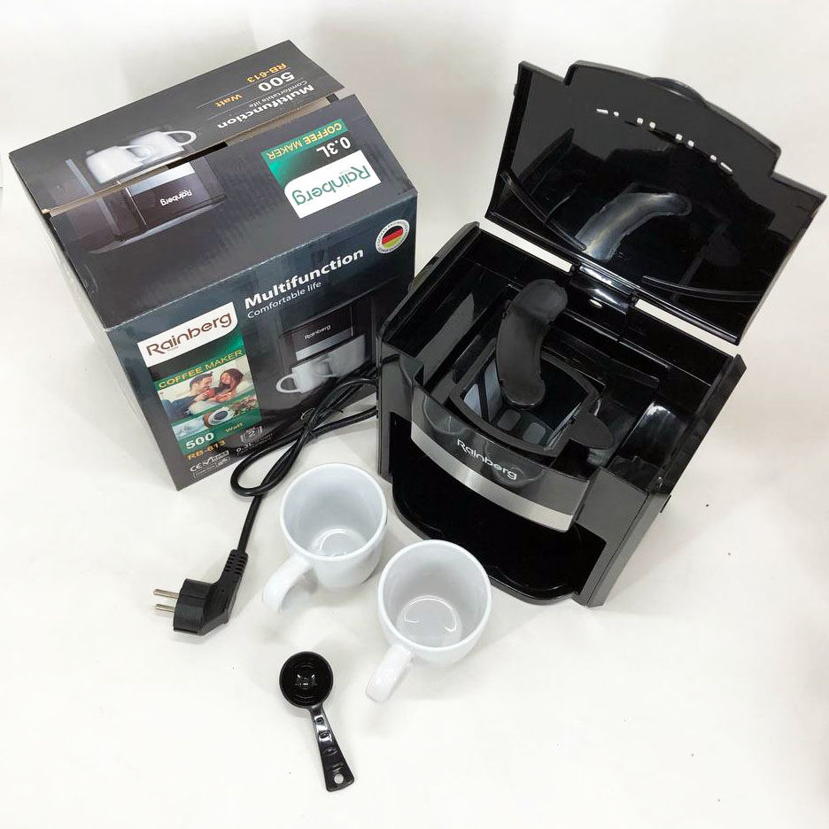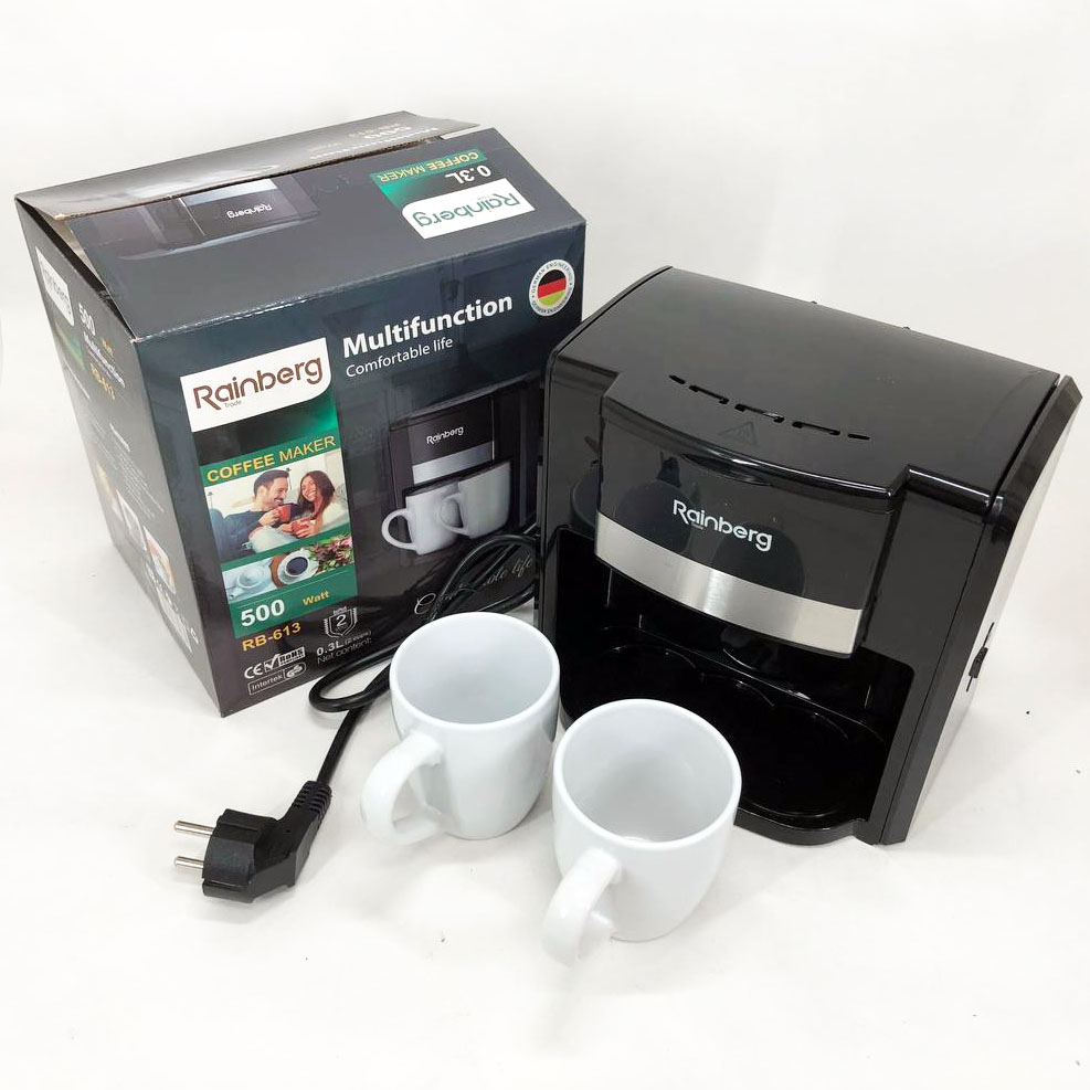 Кофеварка капельная Rainberg RB-613 (0,3 л, 500 Вт) с двумя керамическими чашками, маленькая кофемашина