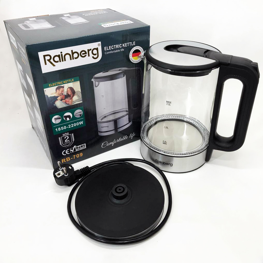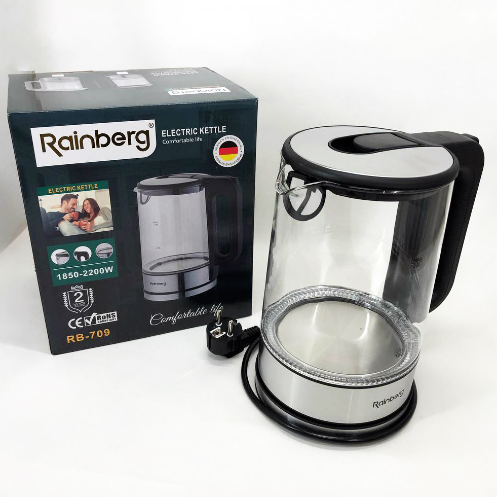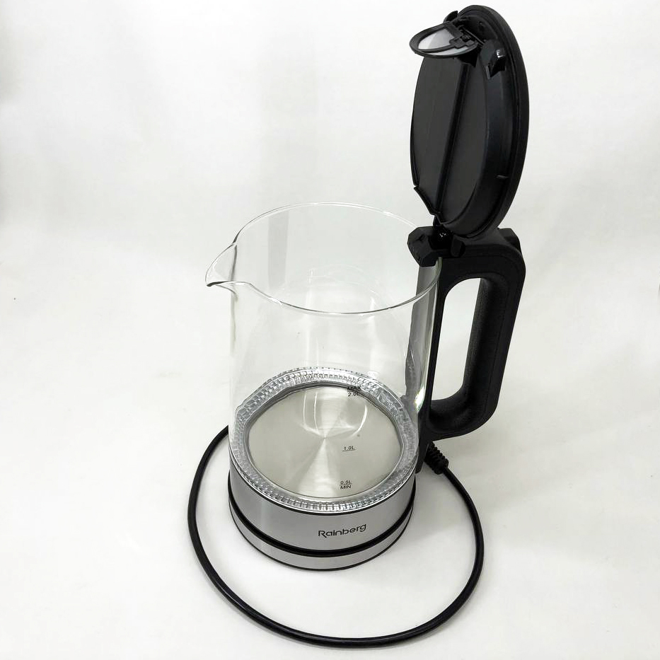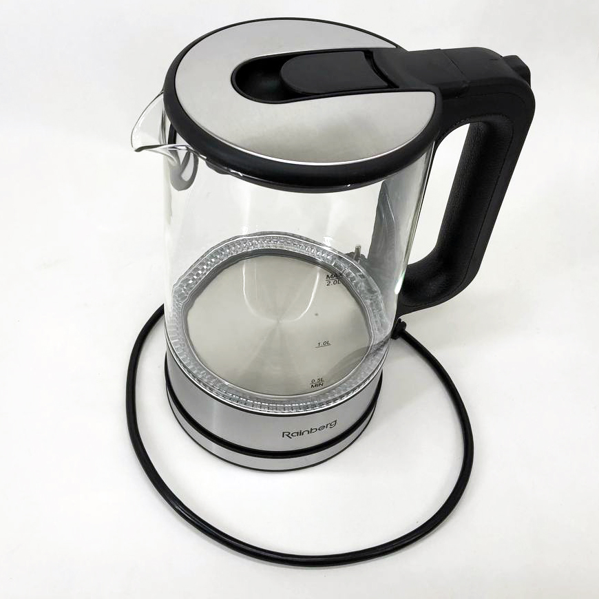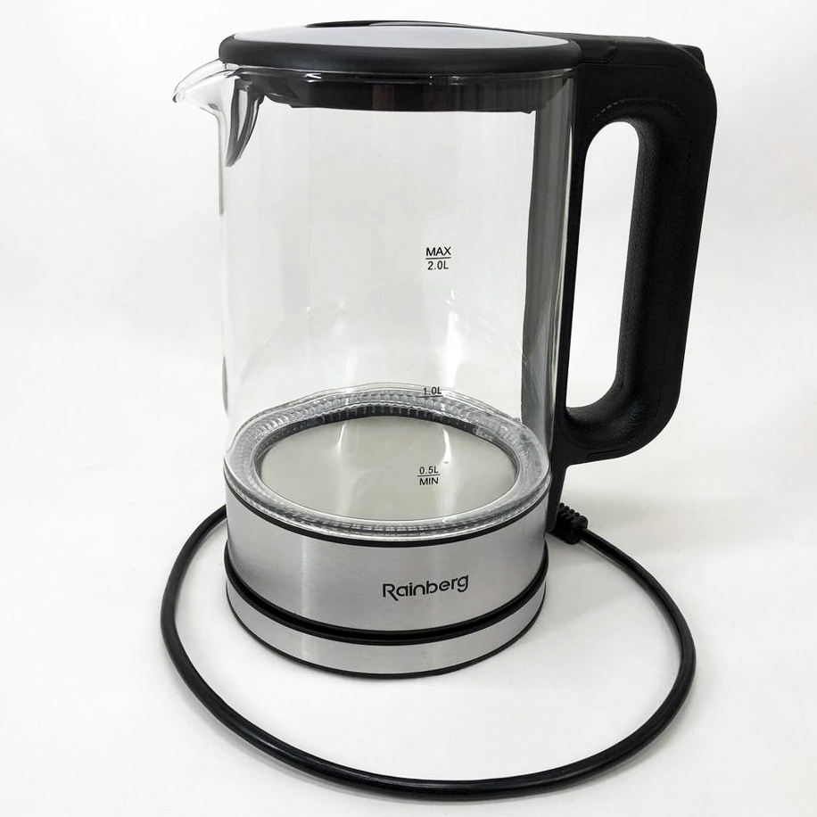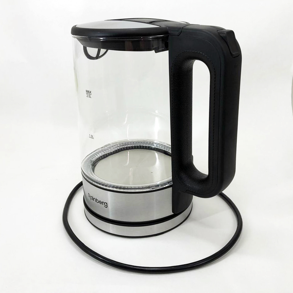 Дисковый электрический чайник Rainberg RB-709 стеклянный с подсветкой, бесшумный чайник. Цвет: черный