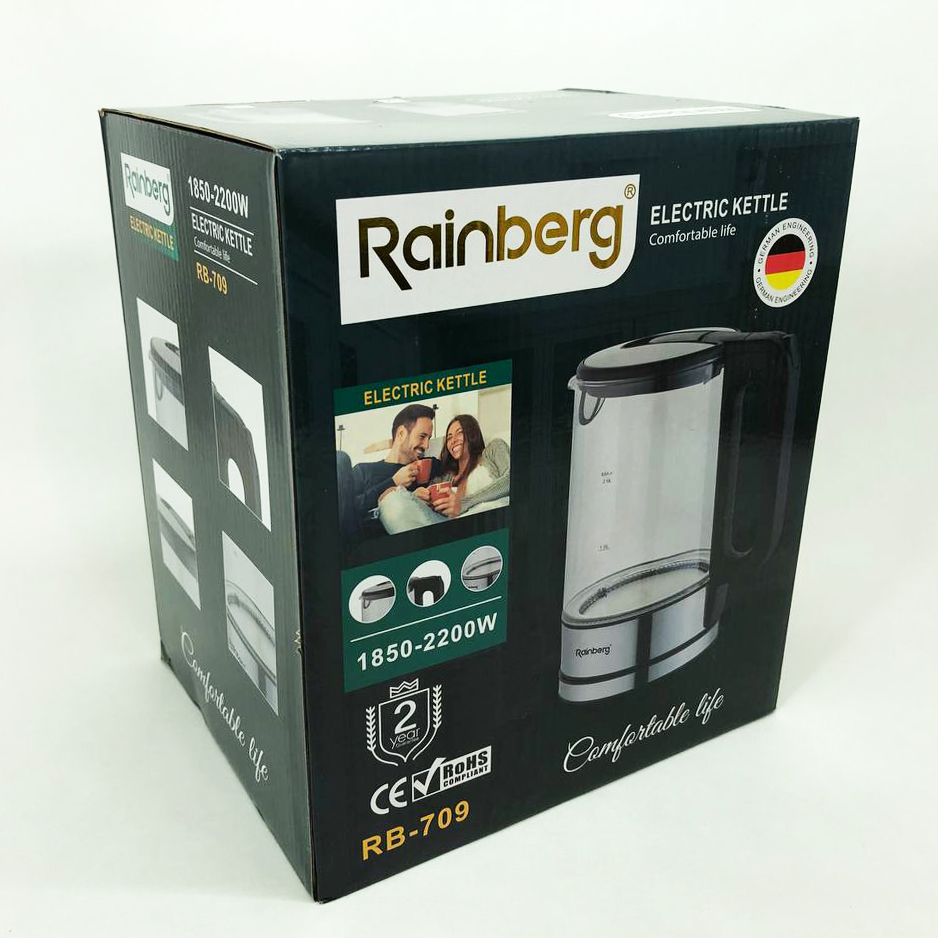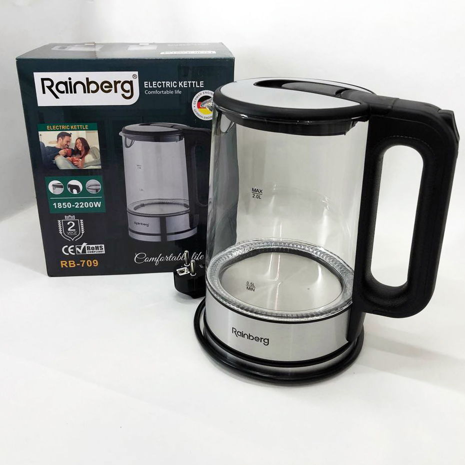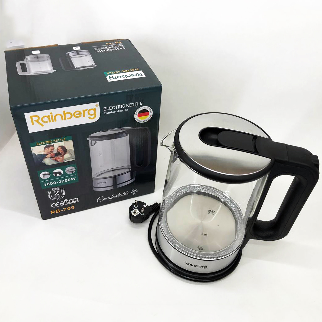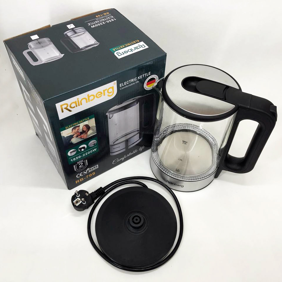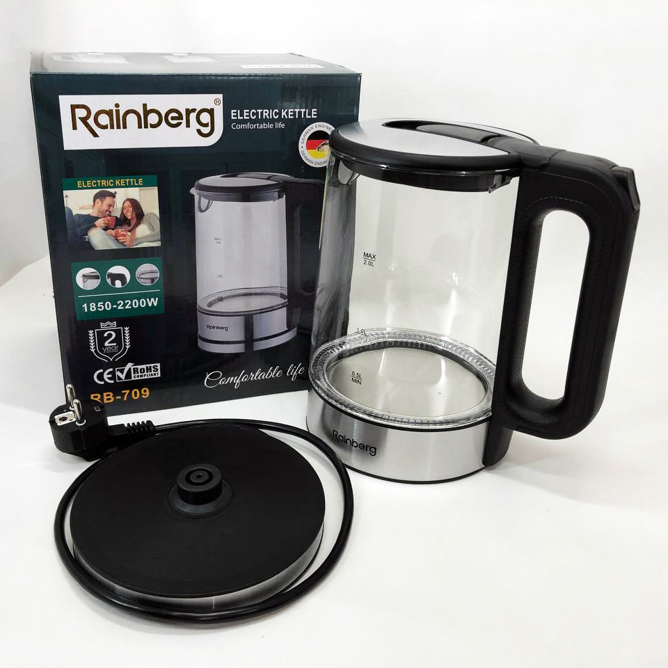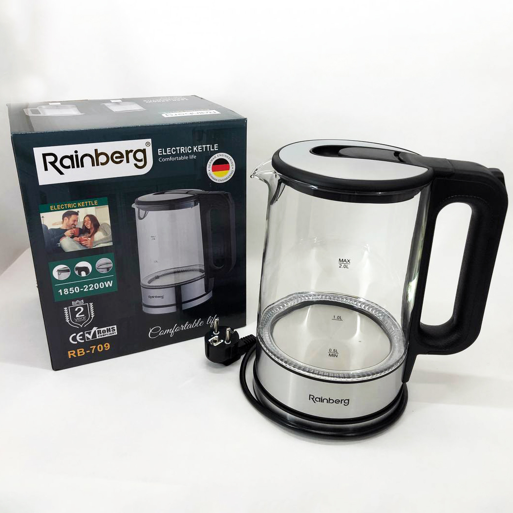 Дисковый электрический чайник Rainberg RB-709 стеклянный с подсветкой, бесшумный чайник. Цвет: черный