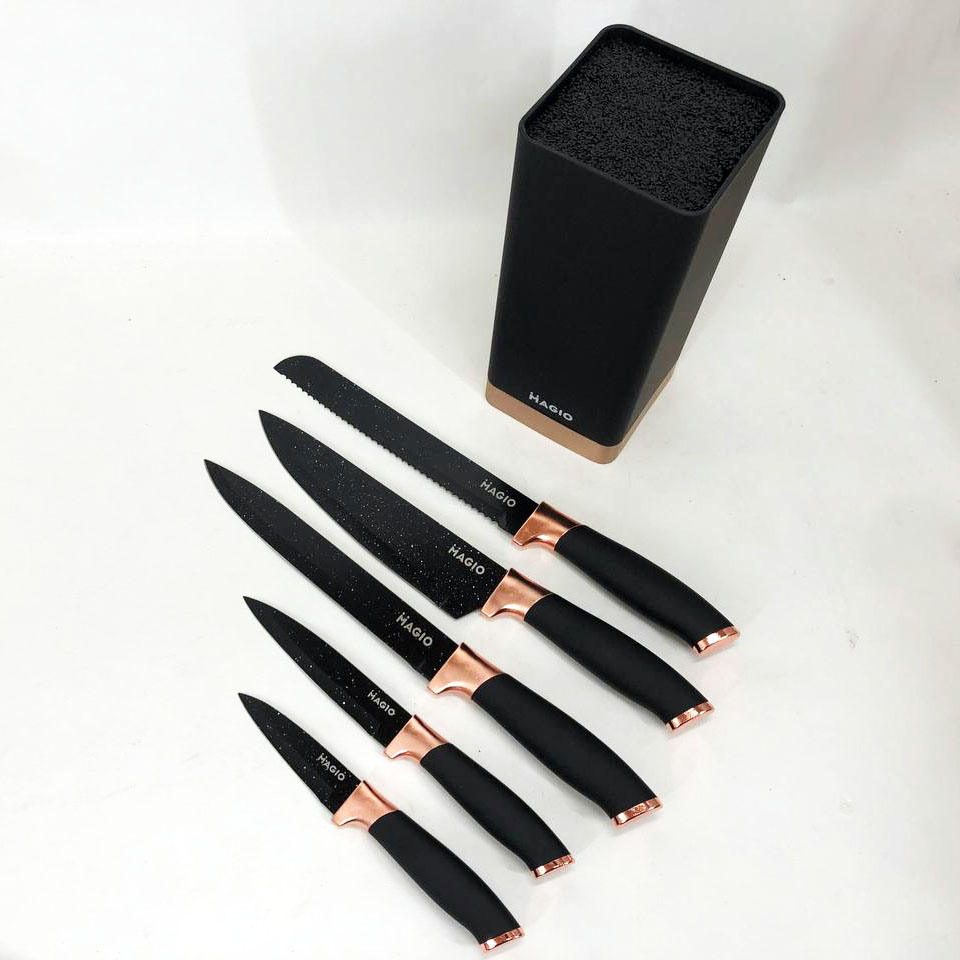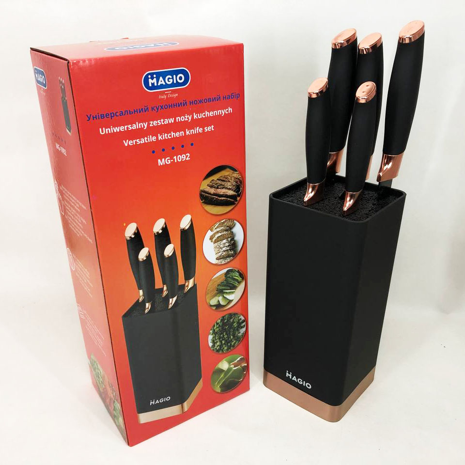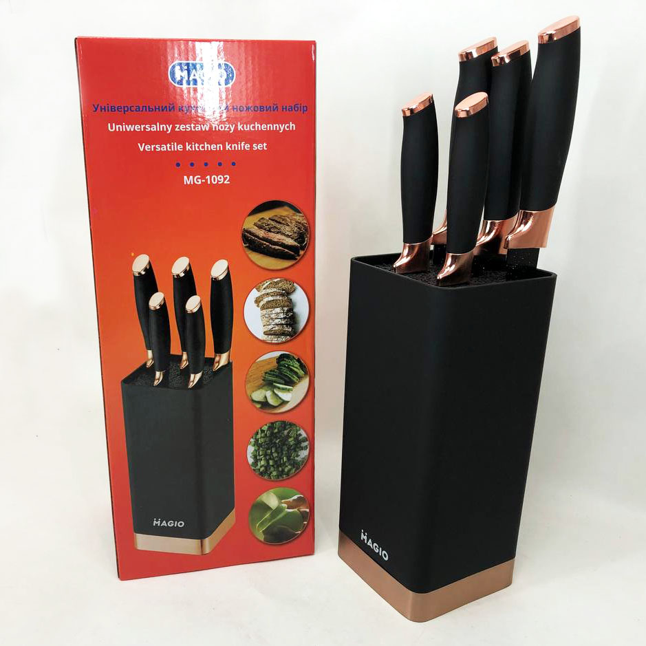 Универсальный набор ножей на подставке — это продуманное решение для тех, кто ценит функциональность и удобство на кухне. Набор включает разнообразные лезвия, обеспечивающие комфортную работу с разными продуктами, от хлеба и овощей до мяса и нарезки. Его продуманная комплектация охватывает все основные задачи, делая процесс приготовления пищи быстрым и эффективным.