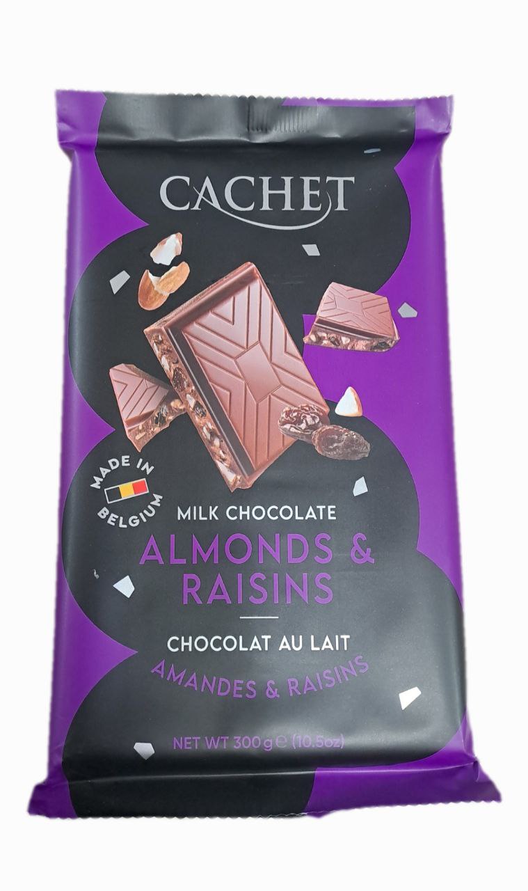 Ніжний молочний шоколад з горіхами та родзинками Cachet – це бельгійський бренд шоколаду, а ми знаємо, що шоколад у Бельгії дуже смачний! Ця плитка не є винятком. Плитка молочного шоколаду з мигдалем та родзинками – це вибух неймовірного смаку навіть у деталях. Ніжний молочний шоколад тане в роті, якісний хрумкий мигдаль та шматочки солодкої родзинок – все це створює незабутню смакову композицію!