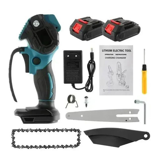 Цепь и удобный кейс для хранения и транспортировки. Удобство работы правой или левой рукой, идеальный вариант мужчинам и женщинам для работ в саду, домашнем хозяйстве, обрезки деревьев, веток, бруса диаметром до 10 см. До 80 резов ветвей диаметром 4 см на 1 заряде аккумуляторной батареи.