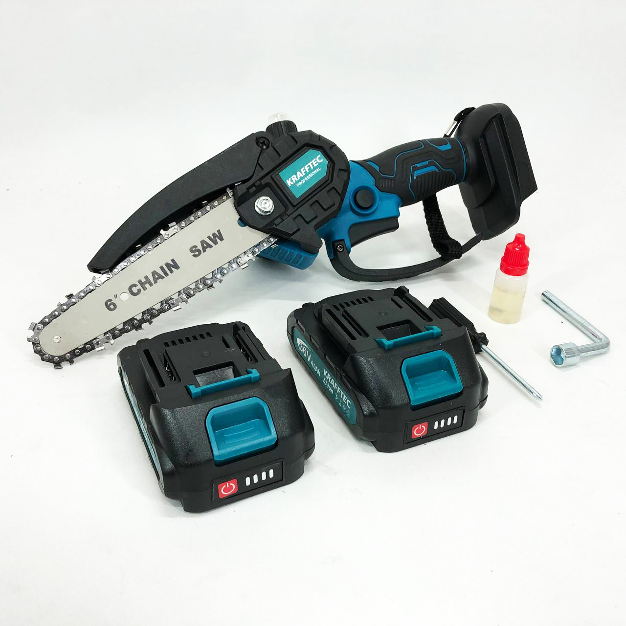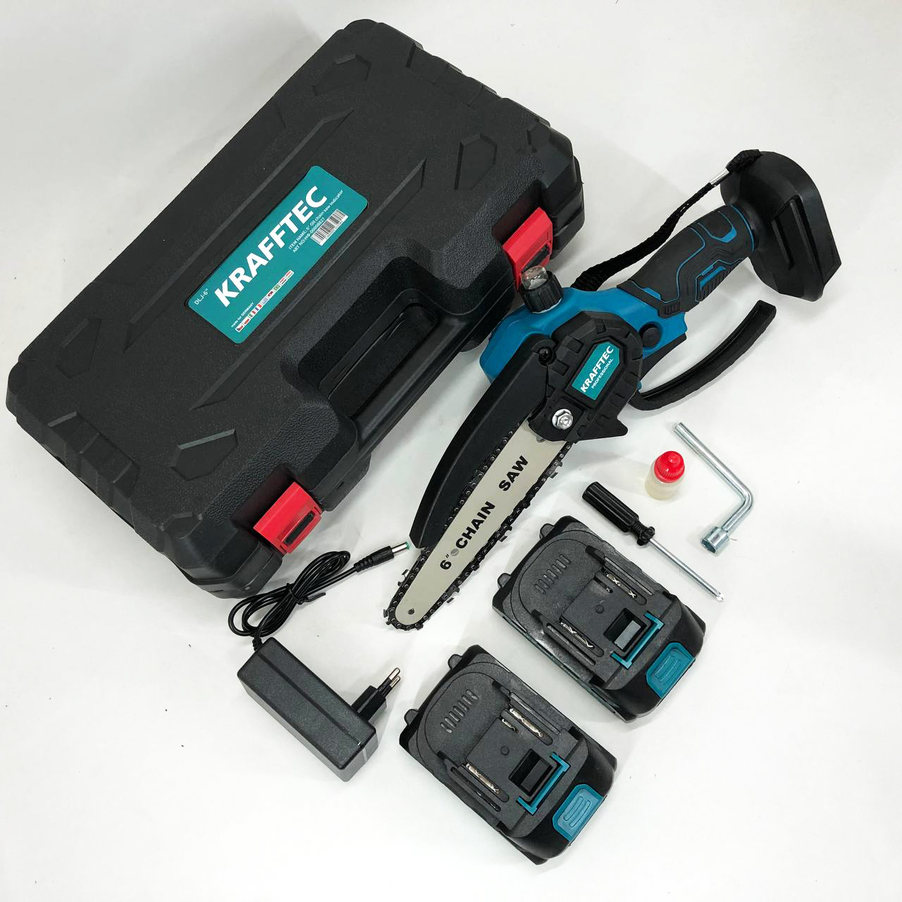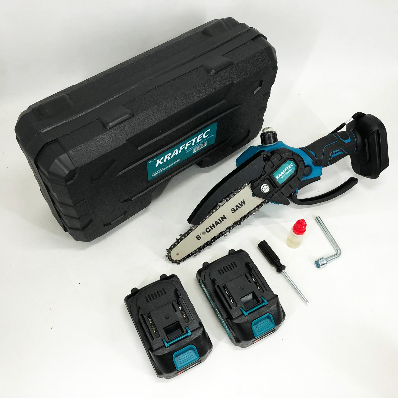 Аккумуляторная цепная мини пила в кейсе Krafftec – это универсальный веткорез для обрезки деревьев и кустарников, для рубки и измельчения садовых отходов и для небольшого строительства из дерева.