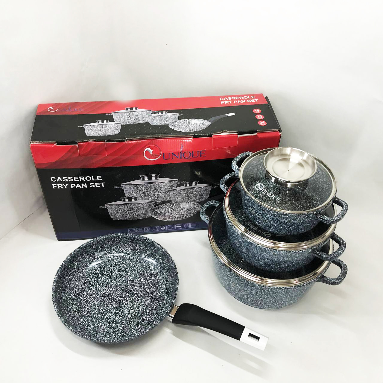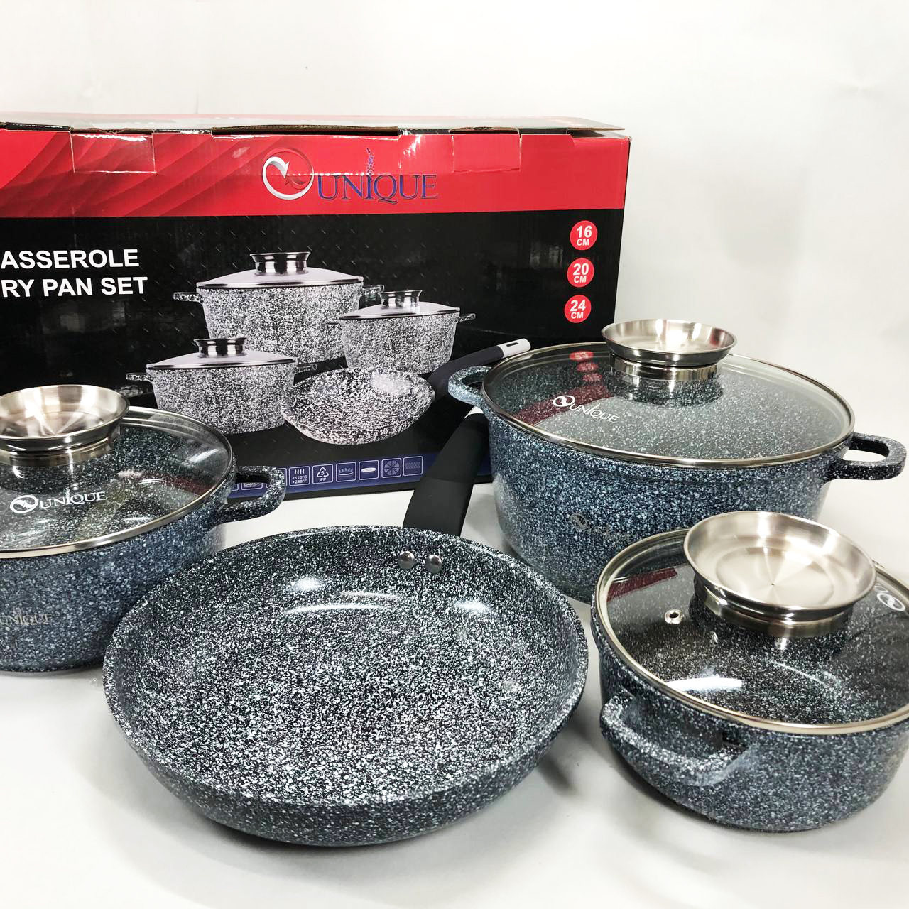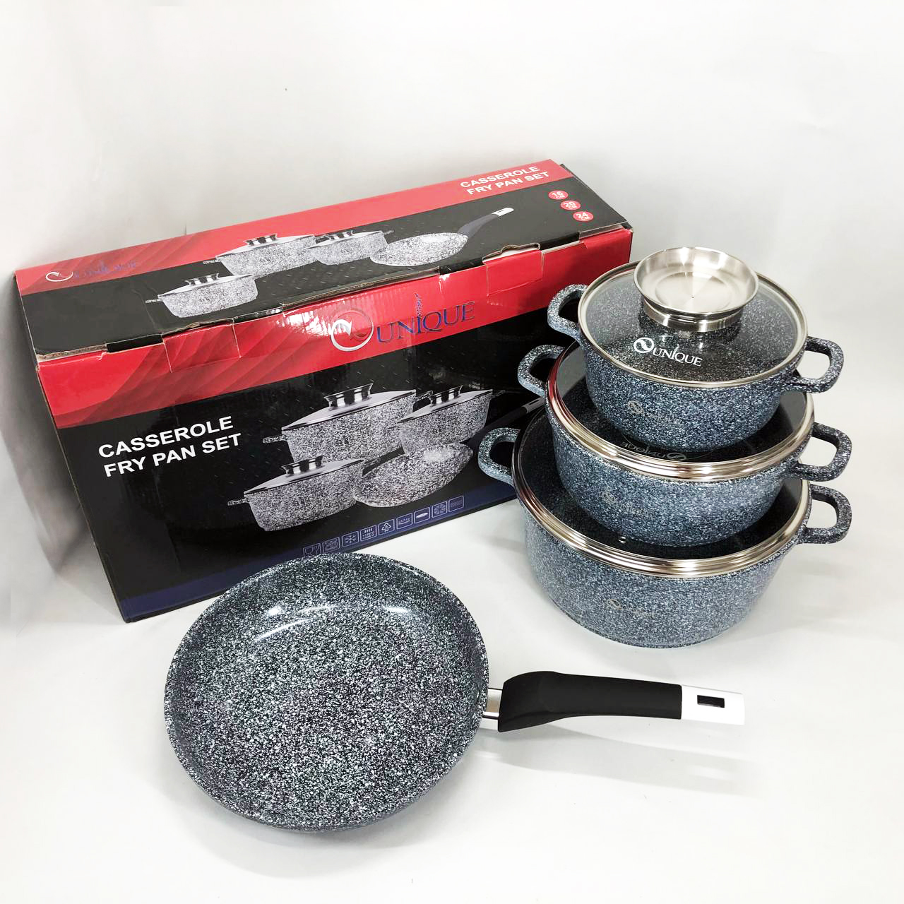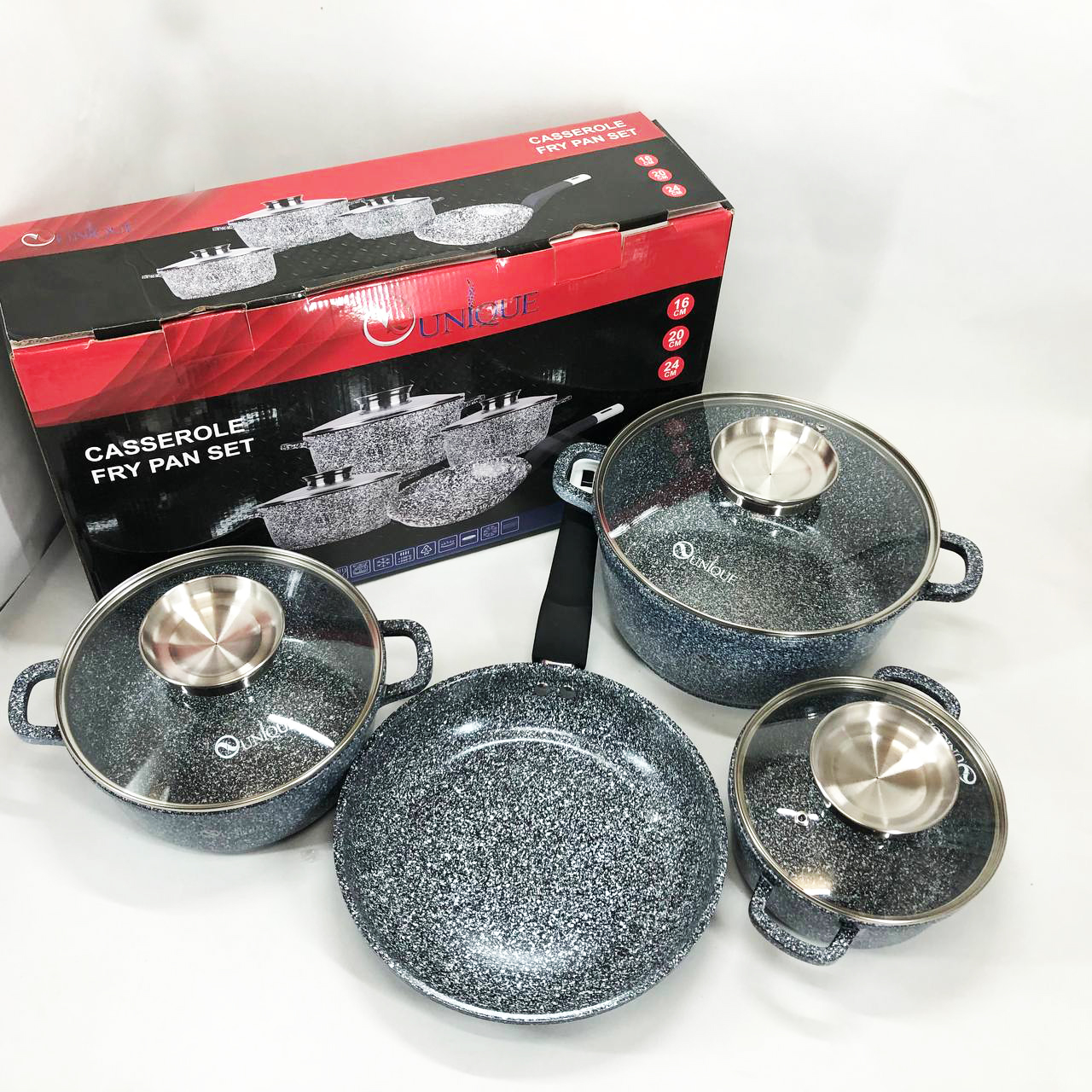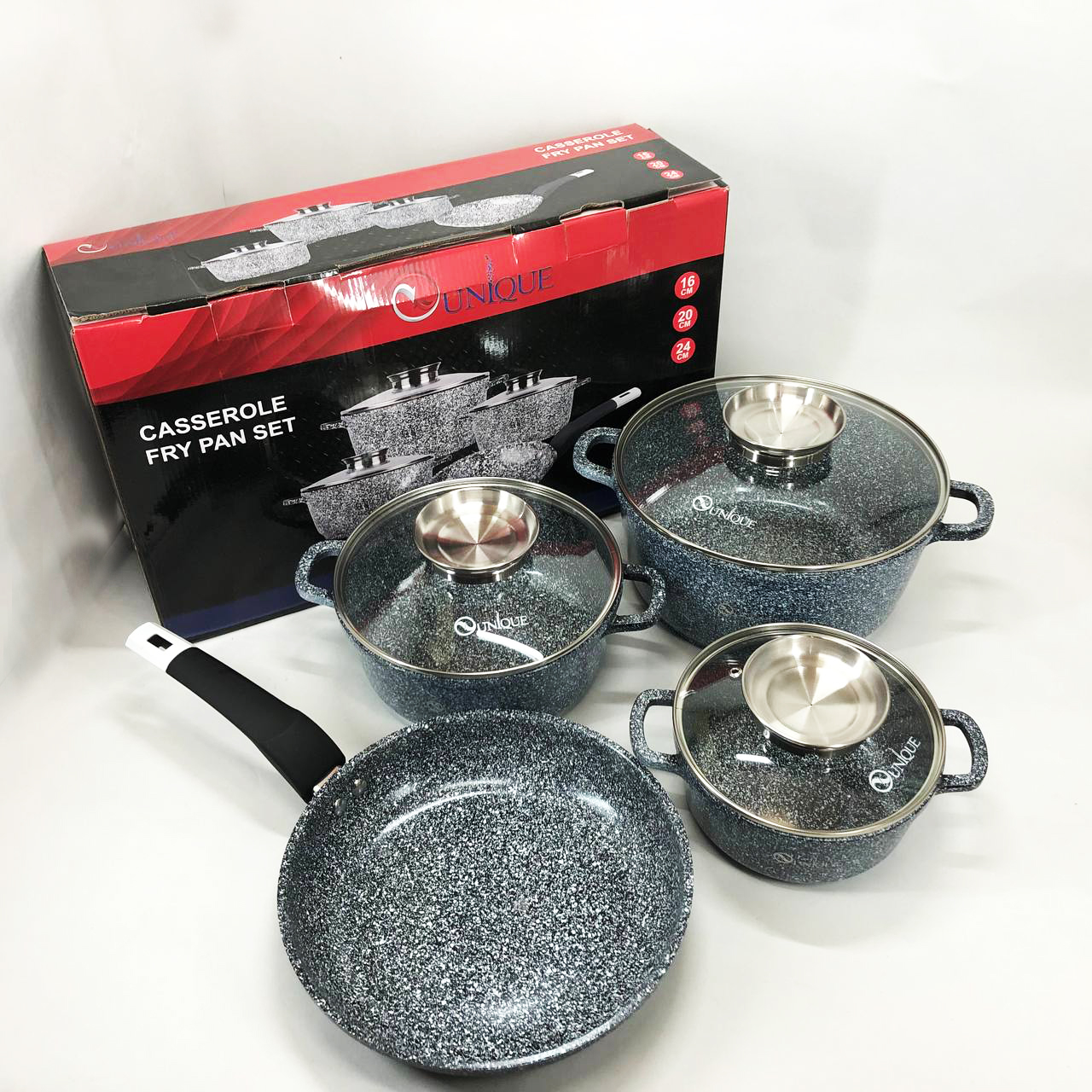 Набор казанов и сковороды алюминиевых со стеклянными крышками 4 предмета (16,20,24см,24см) Unique UN-5521 с внутренним антипригарным покрытием. Набор посуды имеет стеклянные жаропрочные крышки.