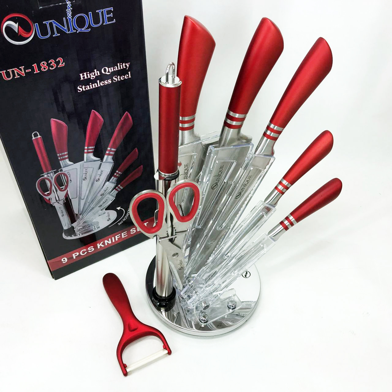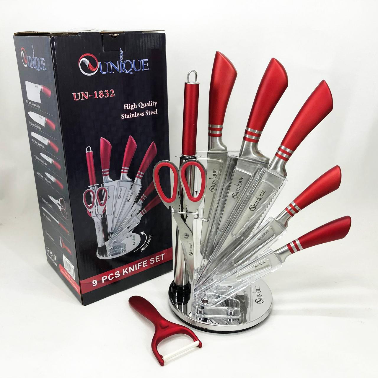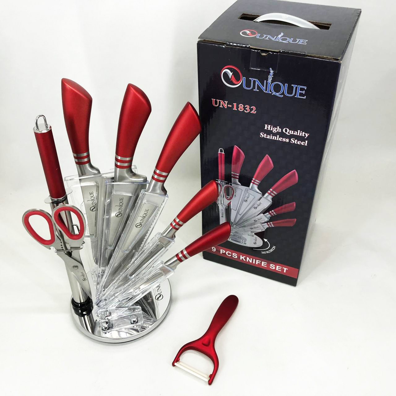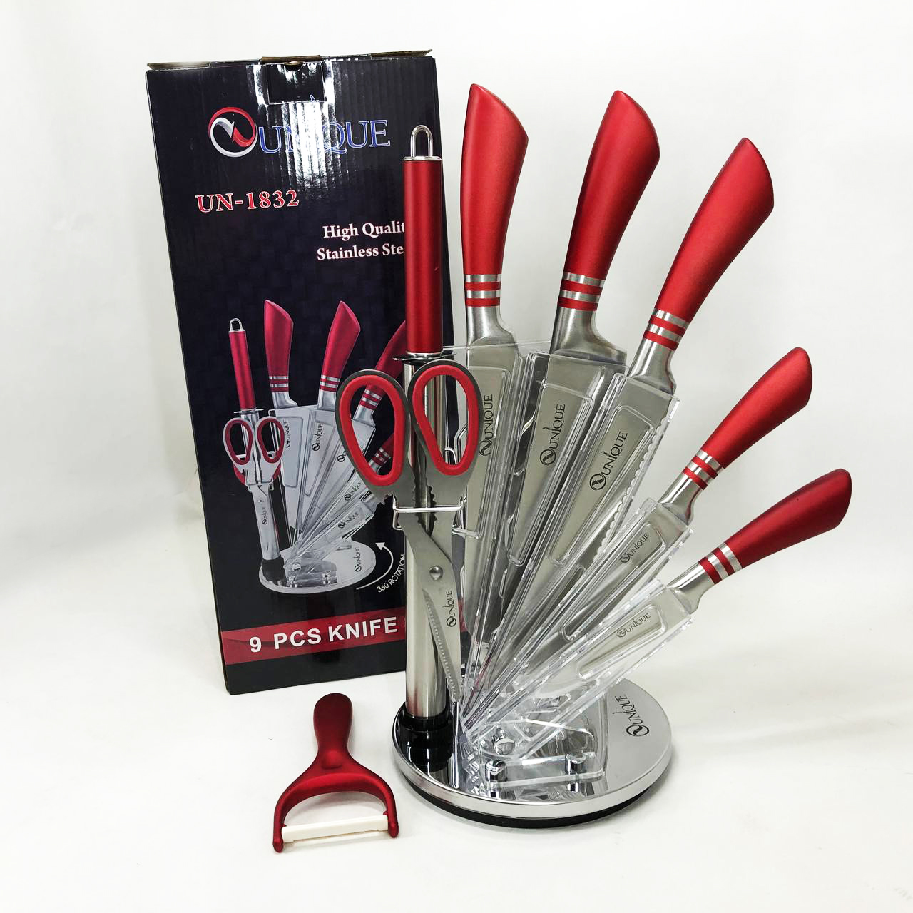 Набор ножей UNIQUE UN-1832 с подставкой 9 предметов овощечистка точилка ножницы Нержавеющая сталь