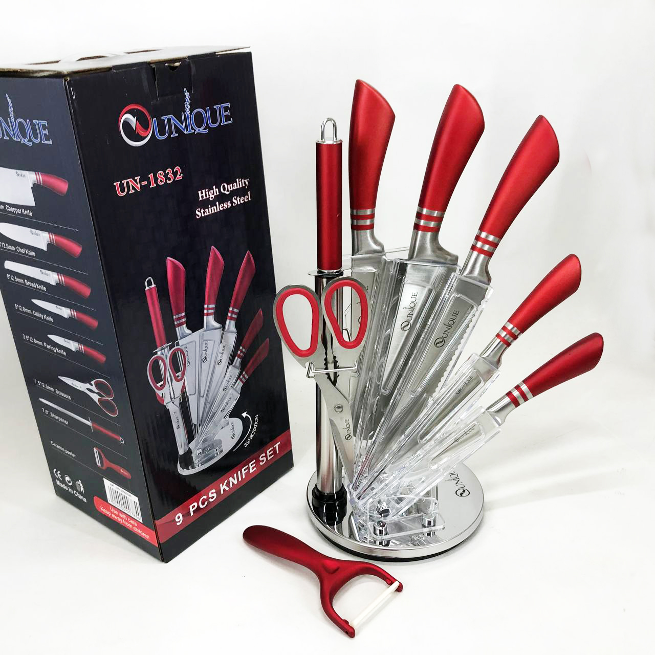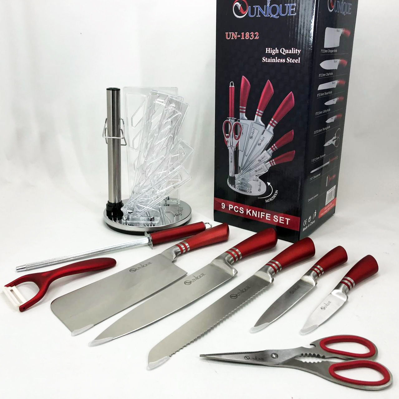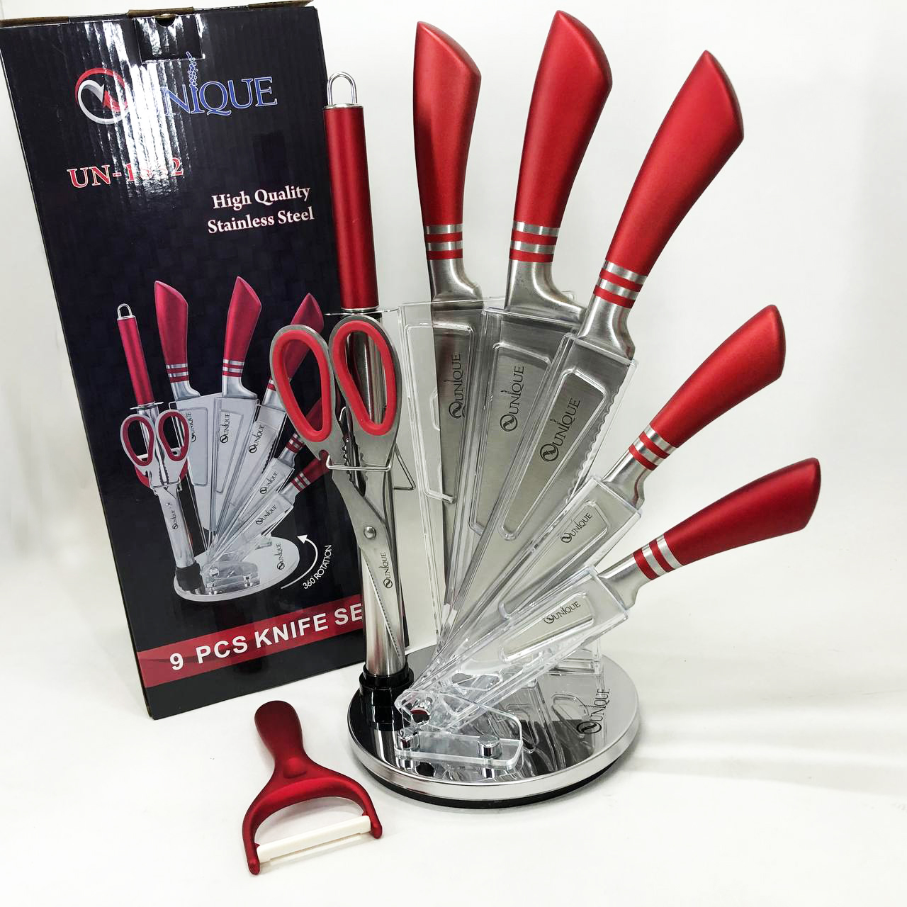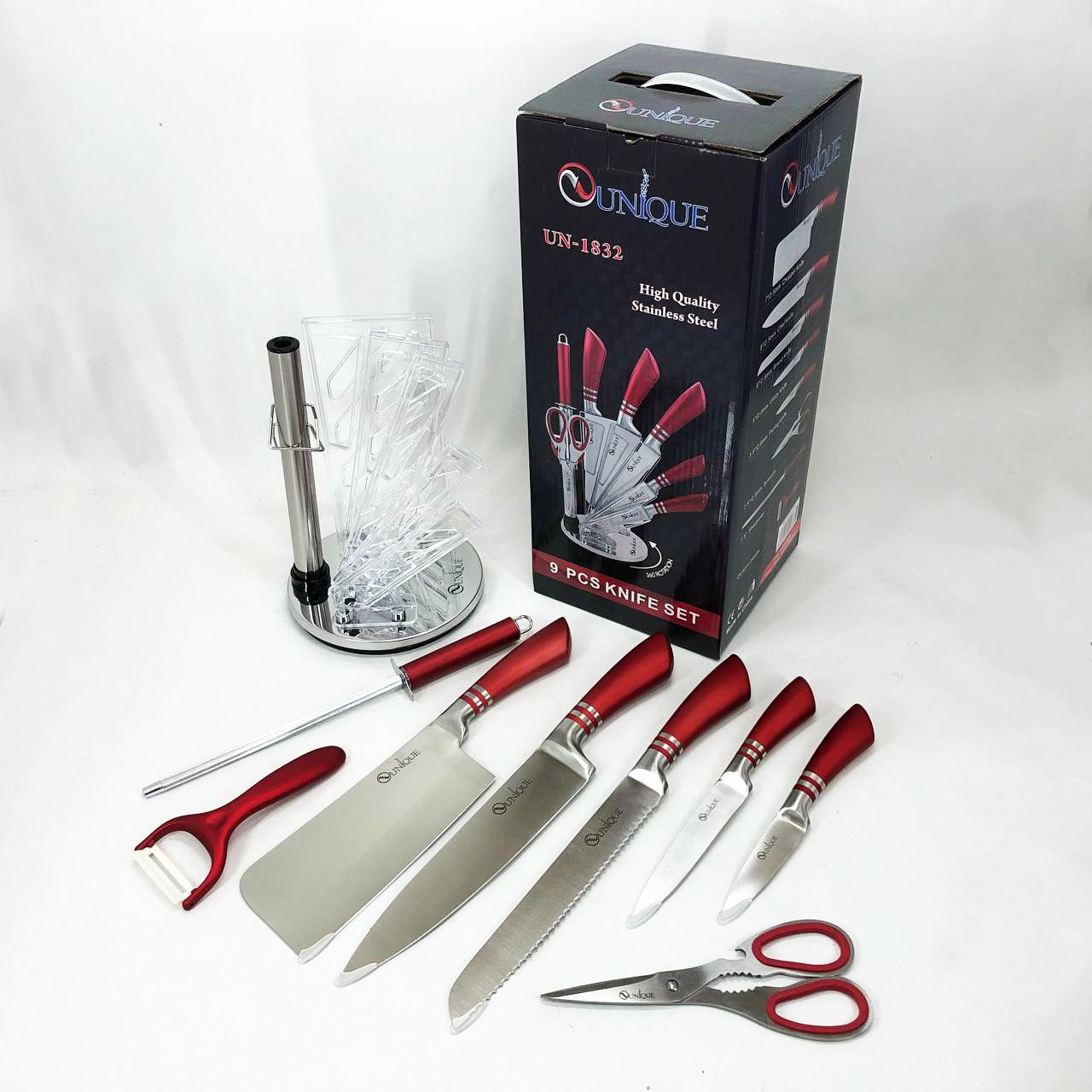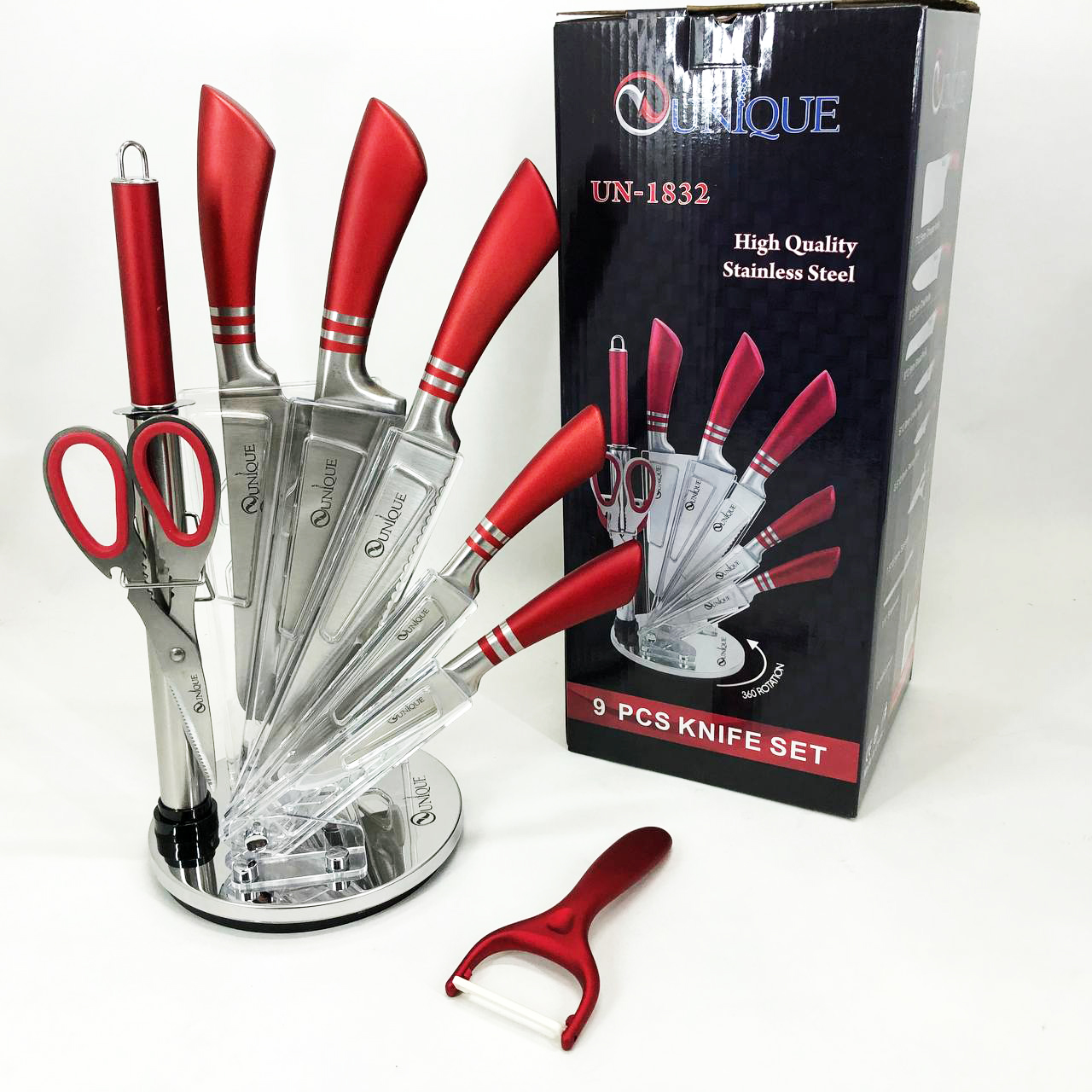 Набор ножей UNIQUE UN-1832 с подставкой 9 предметов овощечистка точилка ножницы Нержавеющая сталь