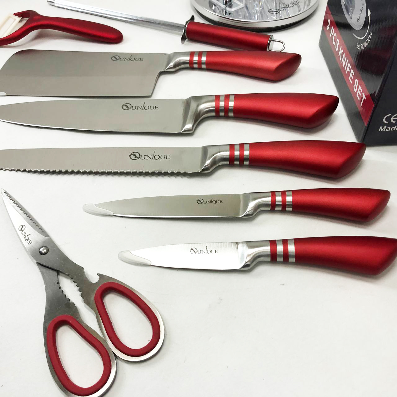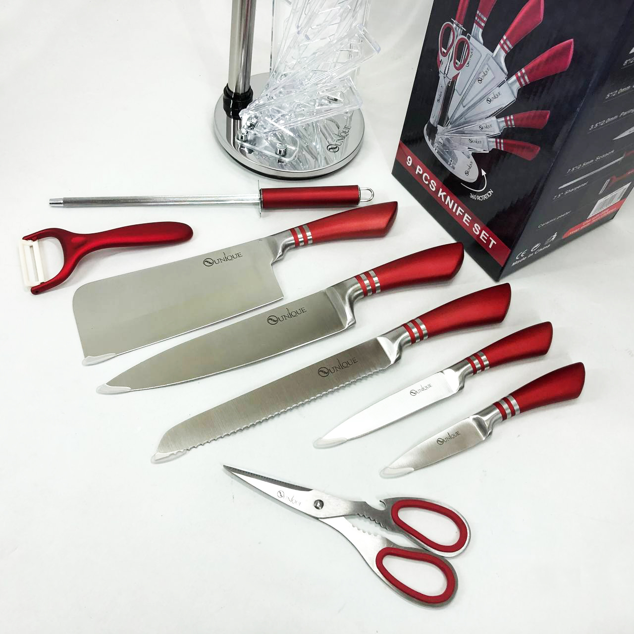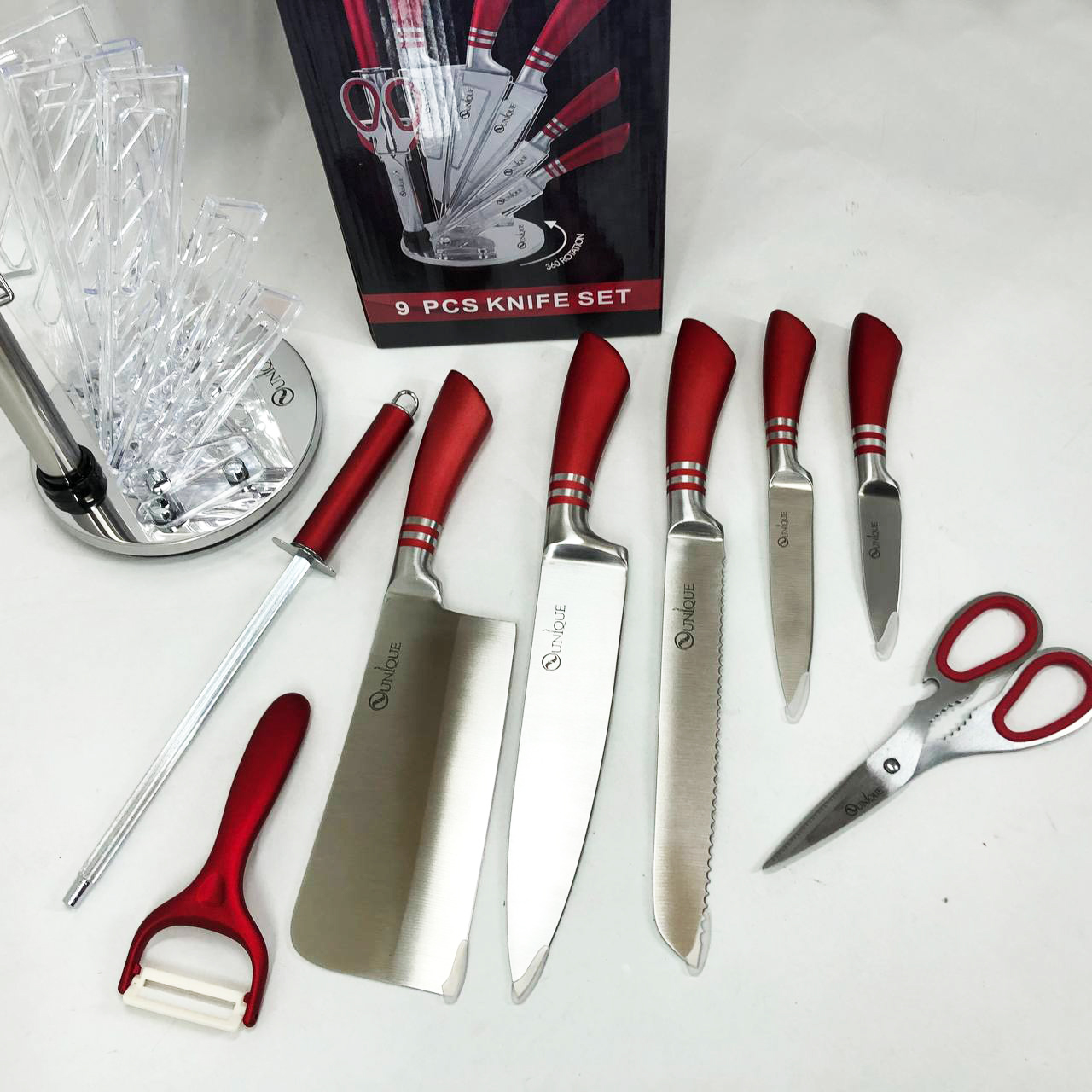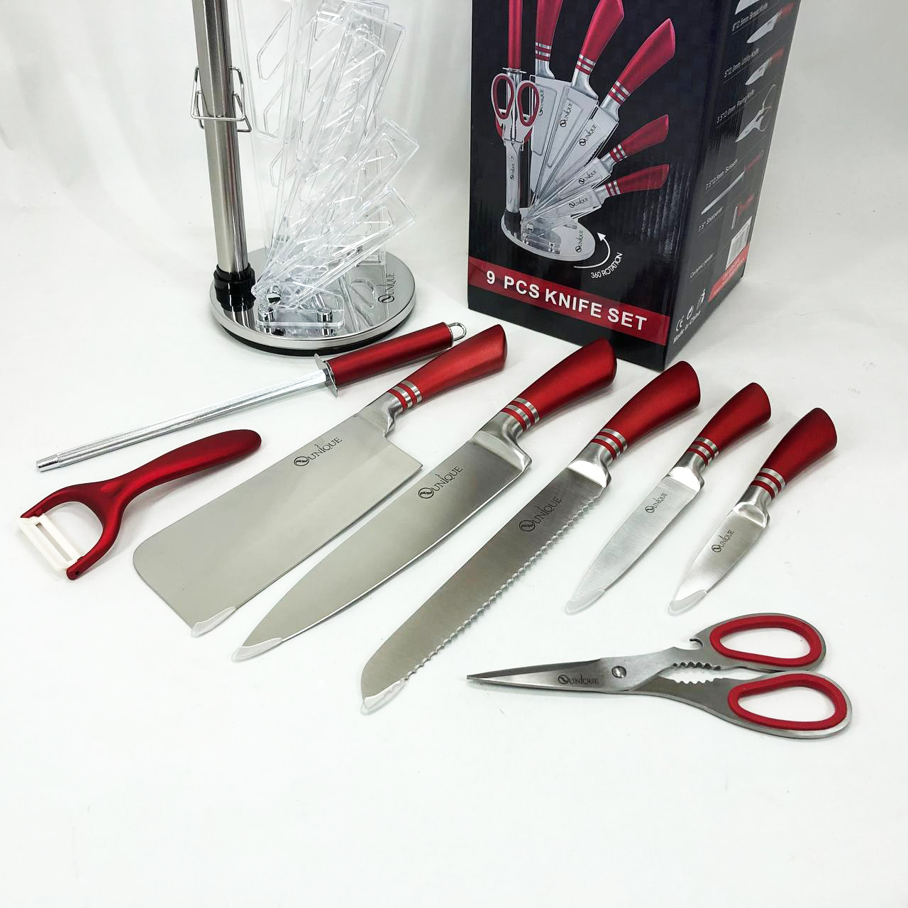 Набор ножей UNIQUE UN-1832 с подставкой 9 предметов овощечистка точилка ножницы Нержавеющая сталь