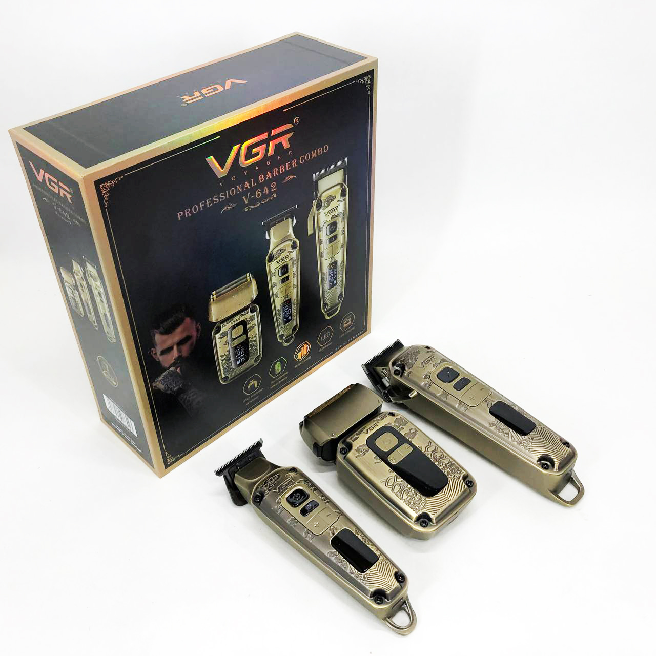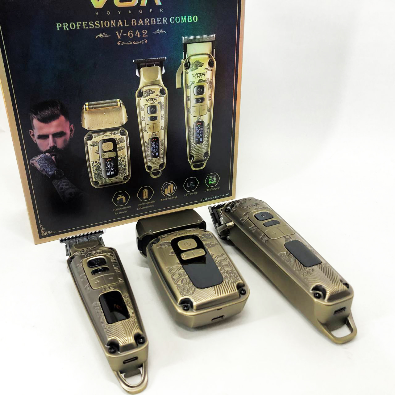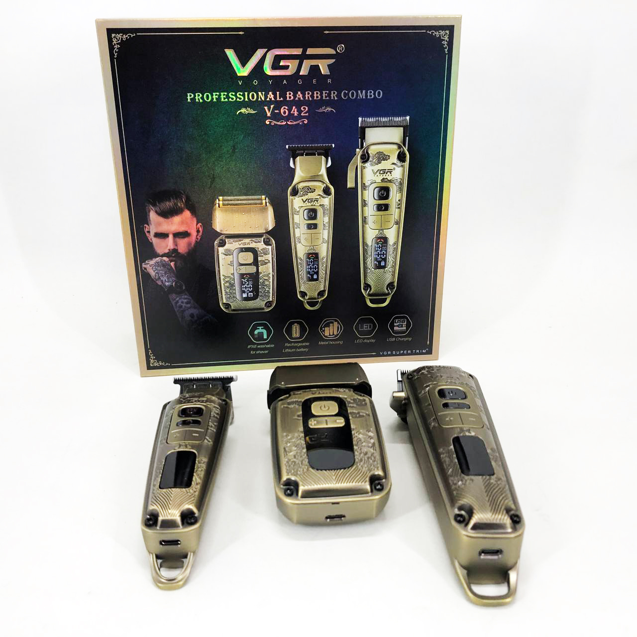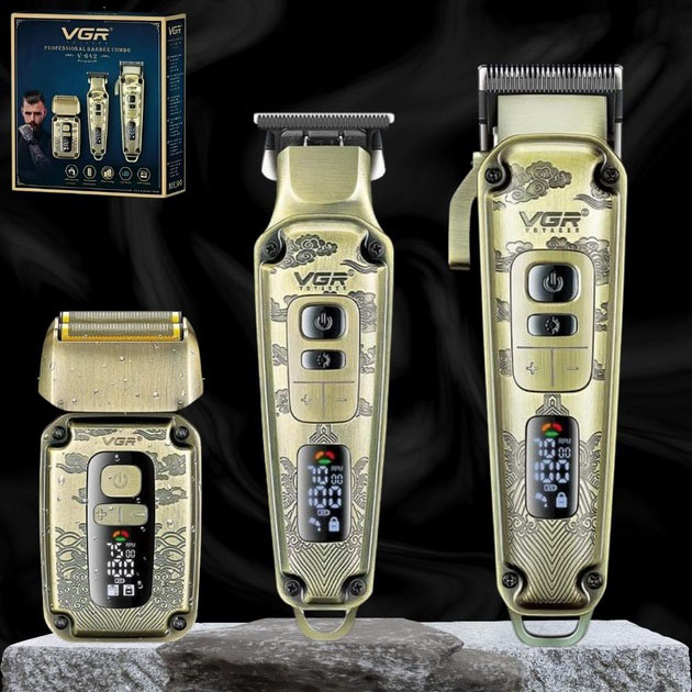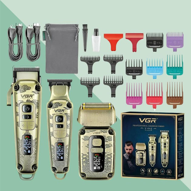 Набор VGR V-642 включает в себя три главных прибора, которыми пользуется каждый мужчина в той или иной мере, это аккумуляторные машинка и триммер для стрижки бороды и волос со сменными насадками и аккумуляторный электрический шейвер для идеальной гладкости кожи, что значительно облегчит жизнь каждому мужчине.