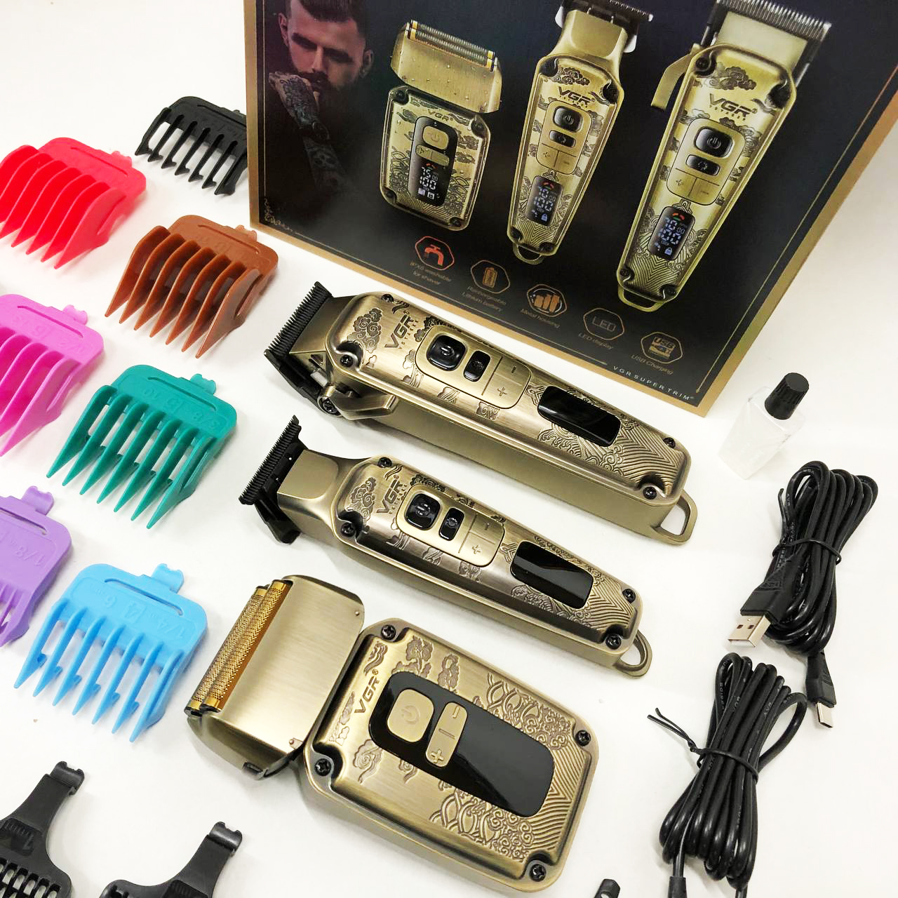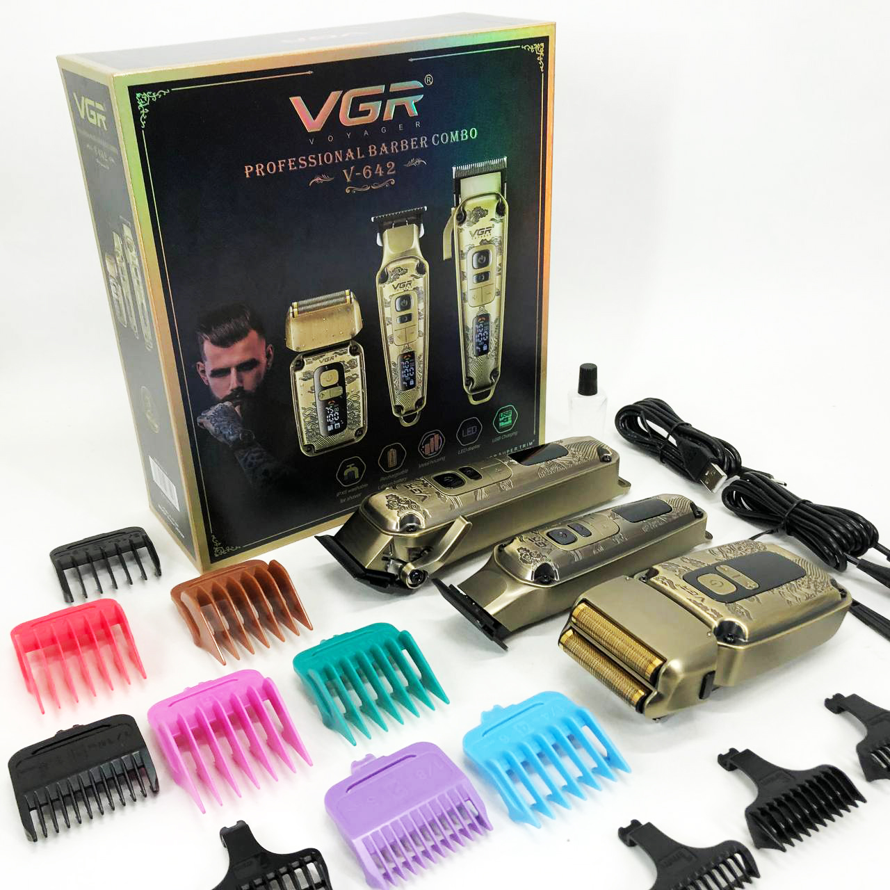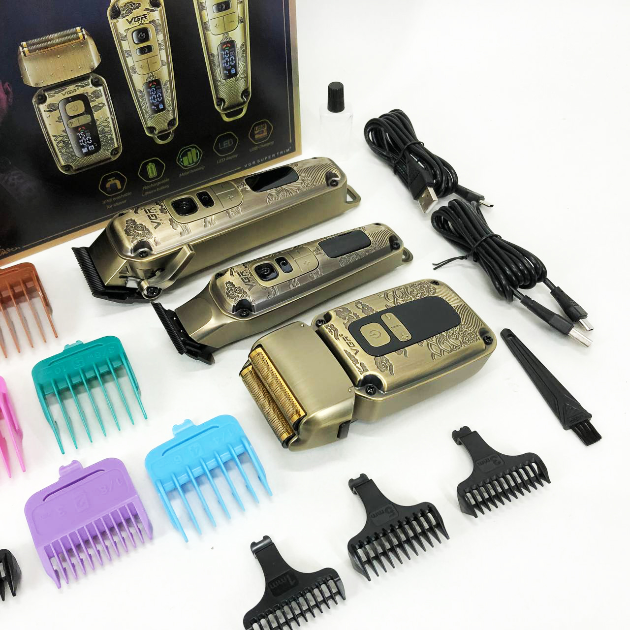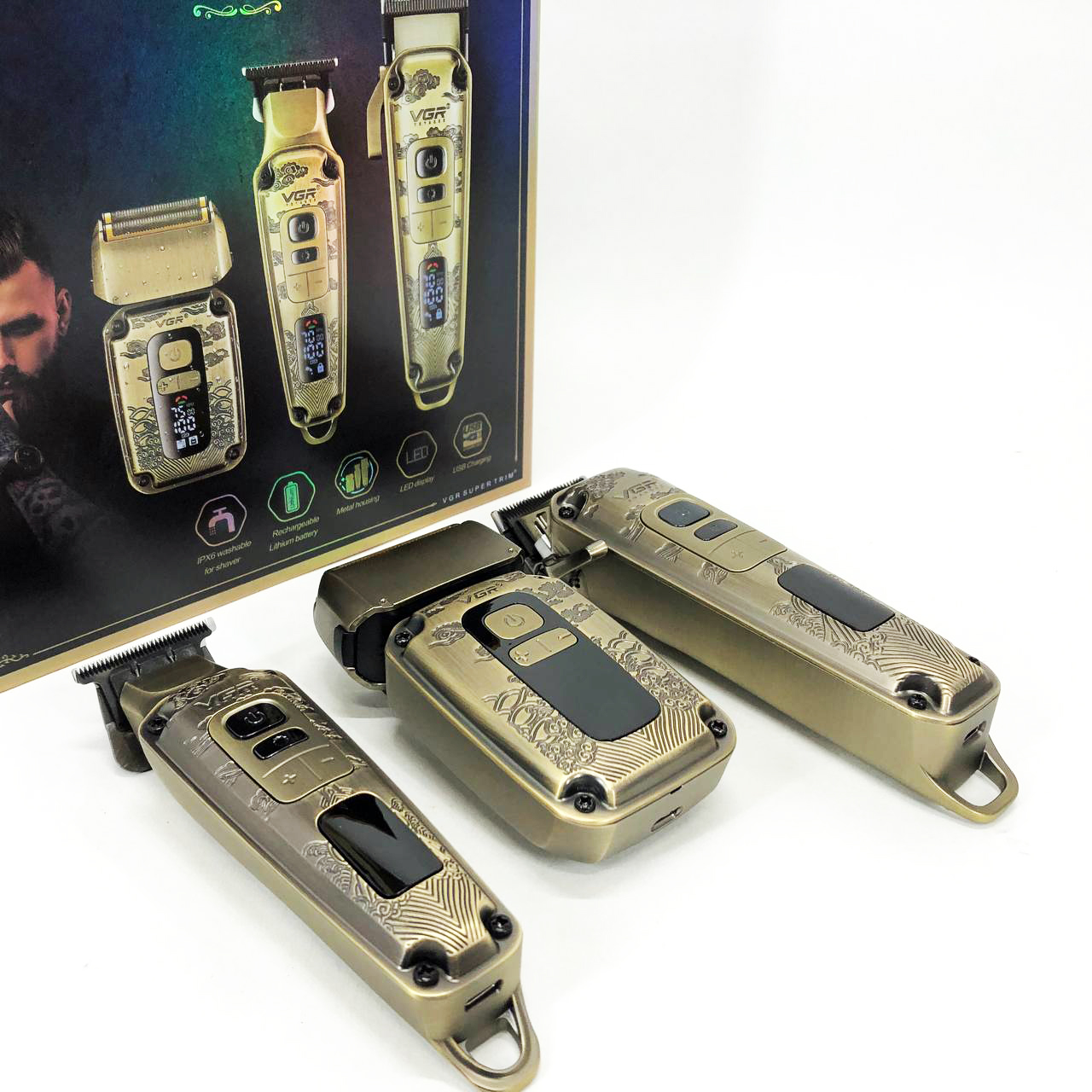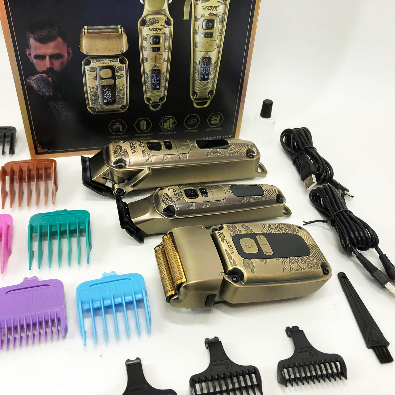 Набор VGR V-642 включает в себя три главных прибора, которыми пользуется каждый мужчина в той или иной мере, это аккумуляторные машинка и триммер для стрижки бороды и волос со сменными насадками и аккумуляторный электрический шейвер для идеальной гладкости кожи, что значительно облегчит жизнь каждому мужчине.