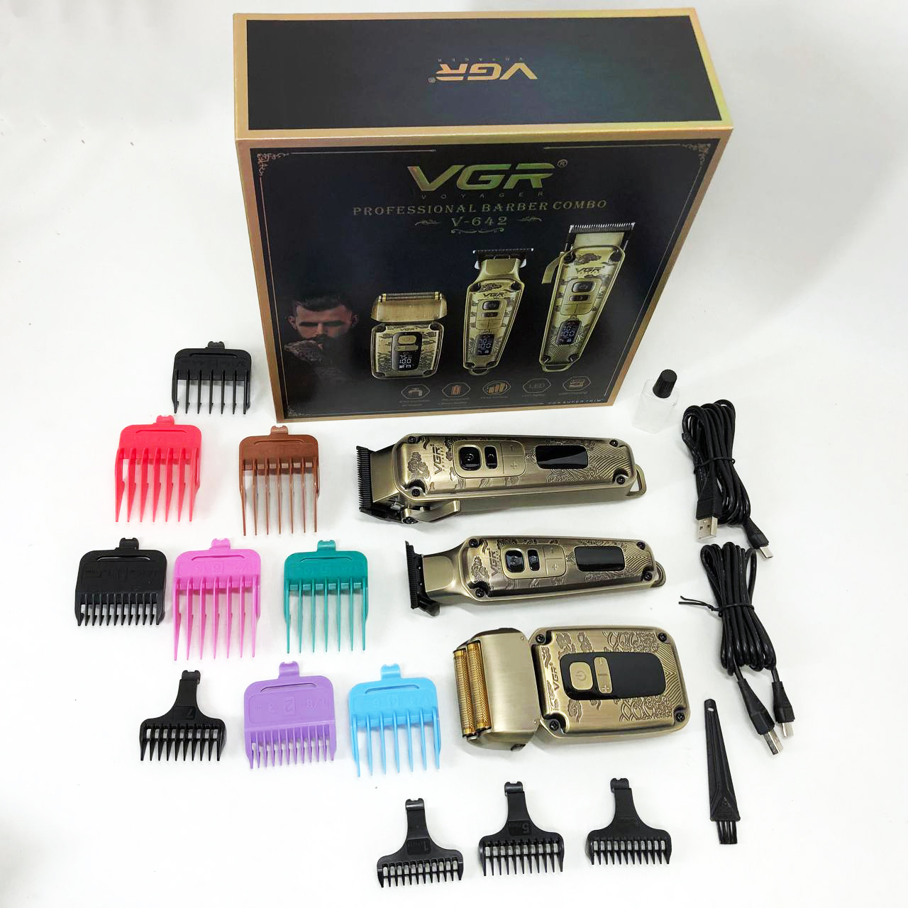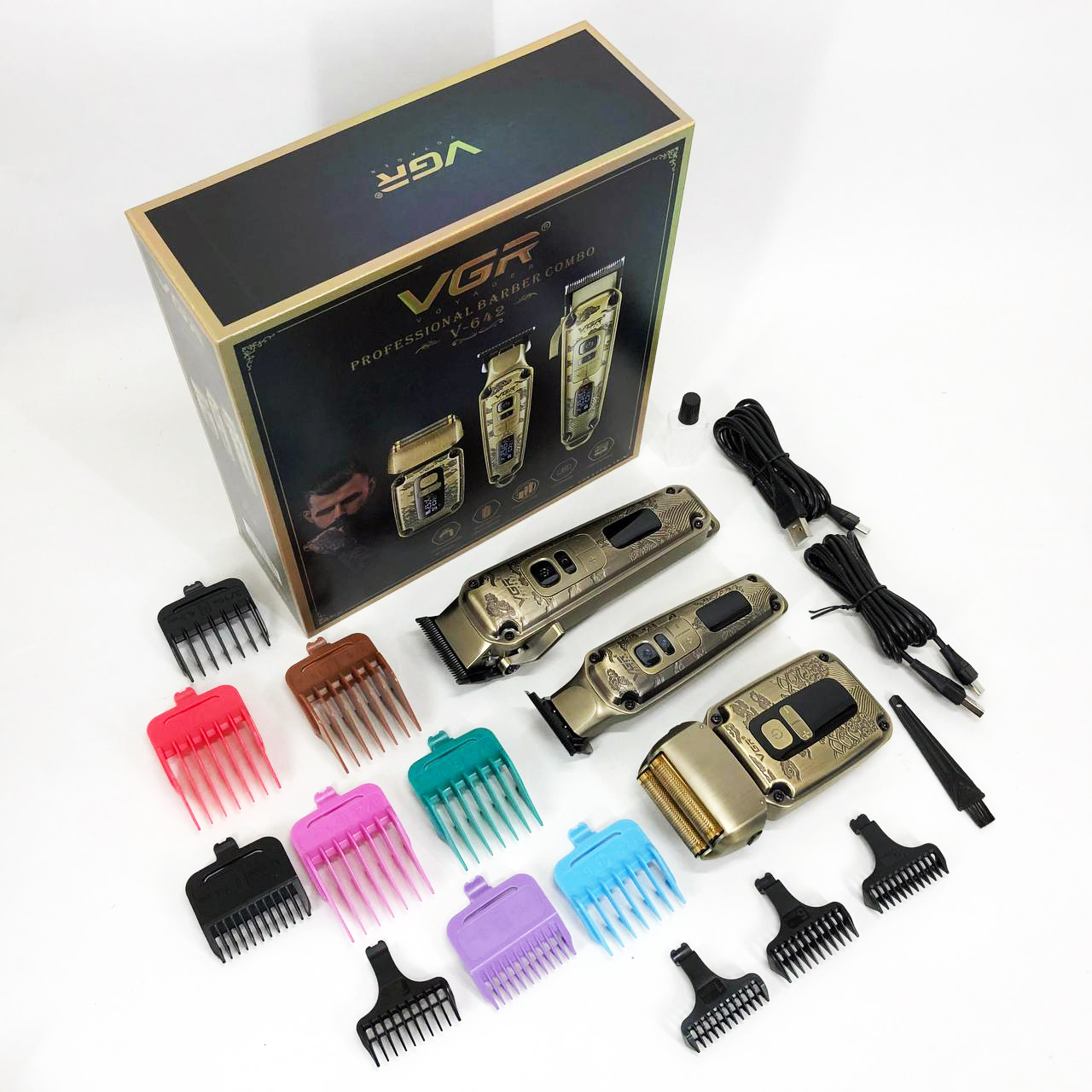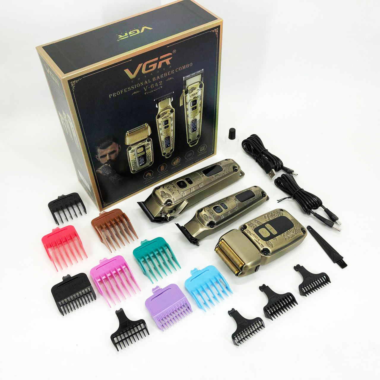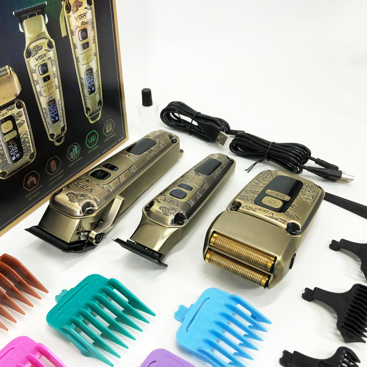 Набор VGR V-642 включает в себя три главных прибора, которыми пользуется каждый мужчина в той или иной мере, это аккумуляторные машинка и триммер для стрижки бороды и волос со сменными насадками и аккумуляторный электрический шейвер для идеальной гладкости кожи, что значительно облегчит жизнь каждому мужчине.
