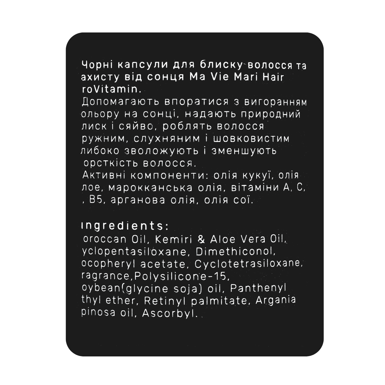 Капсули проти випадіння і для росту волосся Ma Vie Mari Hair ProVitamin Black з вітамінами, оліями аргани, кукуї, соїЧорні капсули для блиску та захисту волосся від сонця Ma Vie Mari Hair ProVitamin Black з олією аргани. Капсульні вітаміни з марокканською олією допомагають надати кольору волосся яскравості, природного блиску і сяйва, роблять локони пружними, слухняними та шовковистими.Вітамінна олія глибоко зволожує волосся і зменшує його жорсткість, повертаючи пасмам м'якість. Цінні ліпіди в складі капсул Ma Vie Mari Hair ProVitamin Black допомагають зміцнити волосся й поліпшити його структуру.Перебування на сонці, холоді, в опалювальних приміщеннях, використання фенів і плойок, часте фарбування і миття волосся жорсткою водою призводить до виснаження волосся. Воно втрачає природний блиск і сяйво. Капсули Ma Vie Mari Hair ProVitamin Black допоможуть швидко повернути пасмам доглянутий вигляд, обволікають і створюють невидиму захисну плівку на всій довжині.Активні компоненти капсул із вітамінами для волосся:олія кукуї: насичує волосся необхідними жирними кислотами, забезпечуючи глибоке зволоження й усунення сухості;
