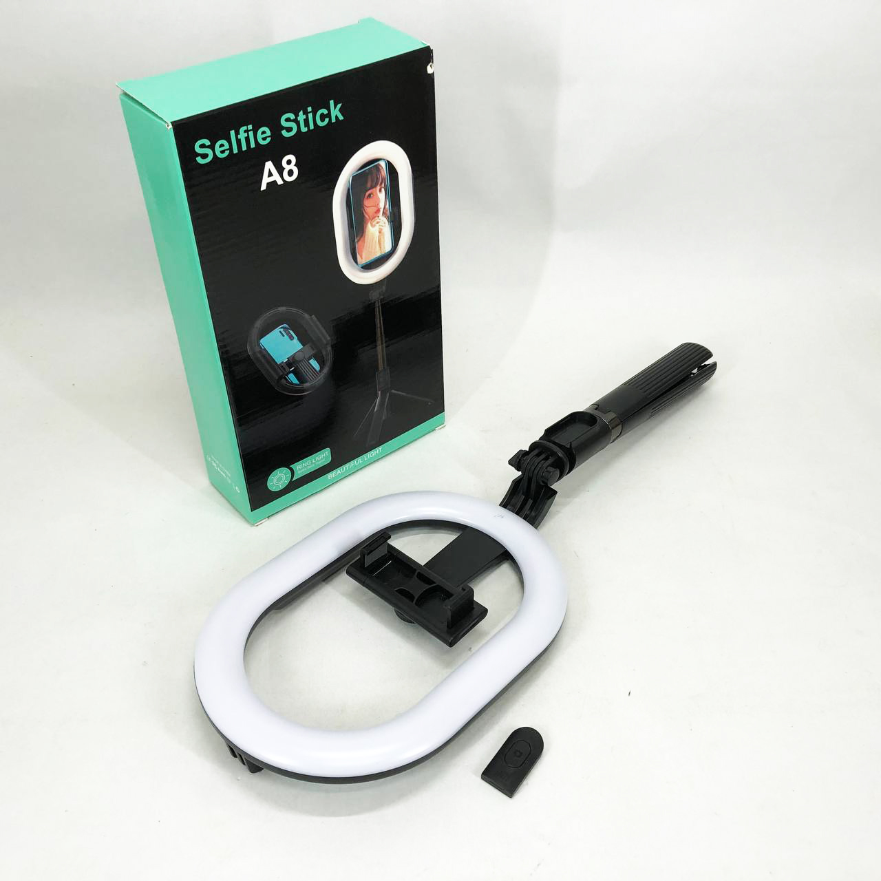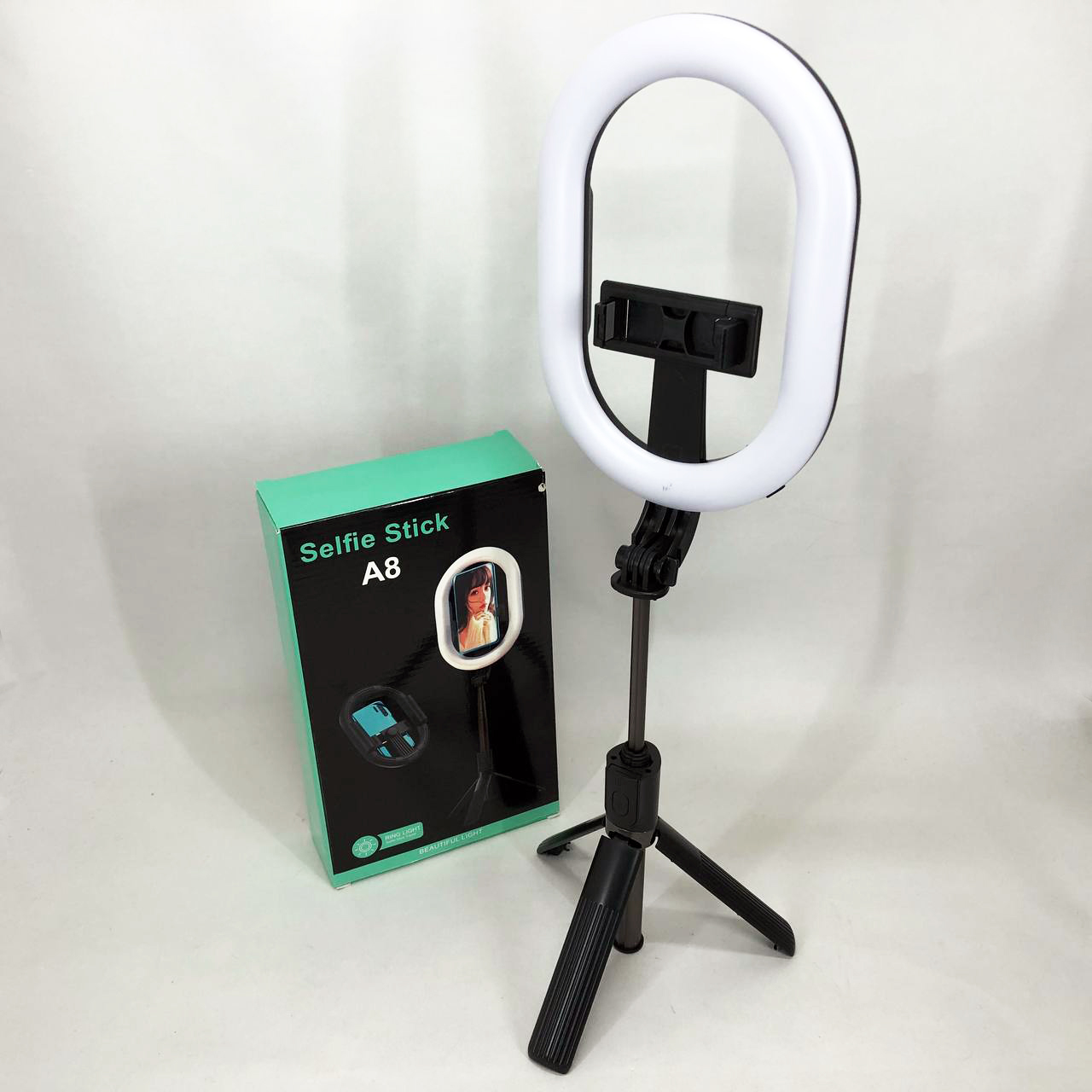 Монопод-трипод с кольцевой LED-подсветкой Selfie Stick A8 – стильное и многофункциональное устройство для съёмки фото и видео. Этот Bluetooth-штатив с трансформируемым дизайном может служить и селфи-палкой, и настольным держателем, оснащен многорежимной LED-подсветкой.