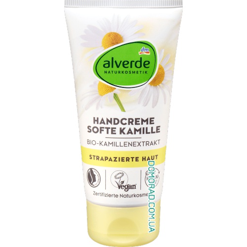 Крем для рук alverde NATURKOSMETIK з органічною ромашкою інтенсивно живить руки та нігті та балує їх приємним ароматом. Крем для рук з підібраними інгредієнтами швидко вбирається, не липне та залишає на шкірі відчуття оксамитової м’якості. Формула зволожує та захищає вражену стресом шкіру.