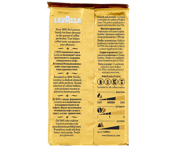 Назва говорить сама за себе! Якість золота – кава абсолютної якості. 100% Арабіка з плантацій Центральної Америки наповнює каву фруктовими та цитрусовими нотками. У доповненні з бразильською Арабікою, яка насичує каву смаком меду та солоду, Lavazza Qualita Oro стає унікальним поєднанням, здатним задовольнити будь-які бажання. Відібрані найкращими фахівцями зерна надають кави незабутній повний аромат та золотисту пінку. Для поціновувачів справжньої італійської кави суміш Lavazza Qualita Oro стане незамінною у приготуванні досконалих напоїв.