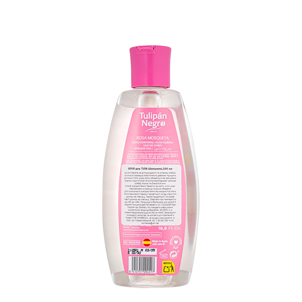 Парфумована олія для тіла Tulipan Negro RosehipНасолоджуйтеся глибоким зволоженням і ніжною турботою з олією для тіла, що огортає шкіру ніжним ароматом шипшини. Його легка формула швидко вбирається, не залишаючи жирного блиску, забезпечуючи тривале зволоження, м'якість і природне сяйво.Олія ідеально підходить для щоденного догляду за тілом і розслаблювального масажу. Засіб живить, пом'якшує й робить шкіру шовковистою на дотик. Аромат залишається з вами упродовж усього дня, даруючи відчуття свіжості та релаксу.Ефект від застосування боді олії:інтенсивне зволоження та живлення;