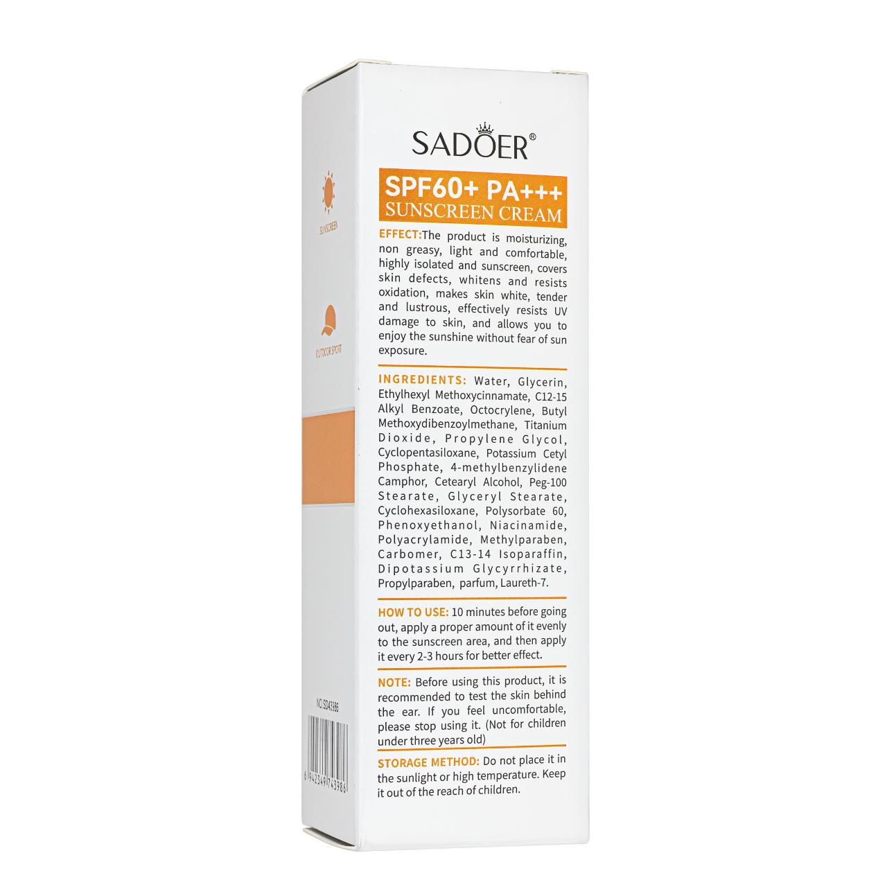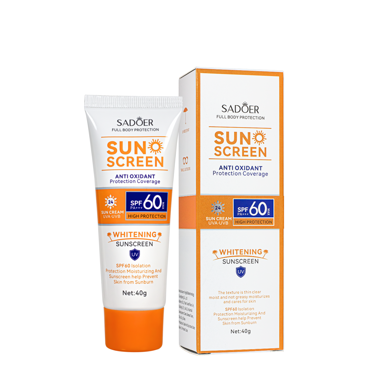 Водостійкий сонцезахисний крем з вибілювальним ефектомСанскрин для обличчя та тіла SPF 60 від Sadoer — ваш максимальний захист від сонця. Він чудово підходить для активного та пляжного відпочинку. Водостійкий сонцезахисний крем для обличчя SPF 60 надійно захищає шкіру від ультрафіолетових променів UVA і UVB, запобігаючи фотостарінню, появі пігментних плям і сухості шкіри.Основні переваги крему від засмаги від Sadoer:підходить для щоденного використання;