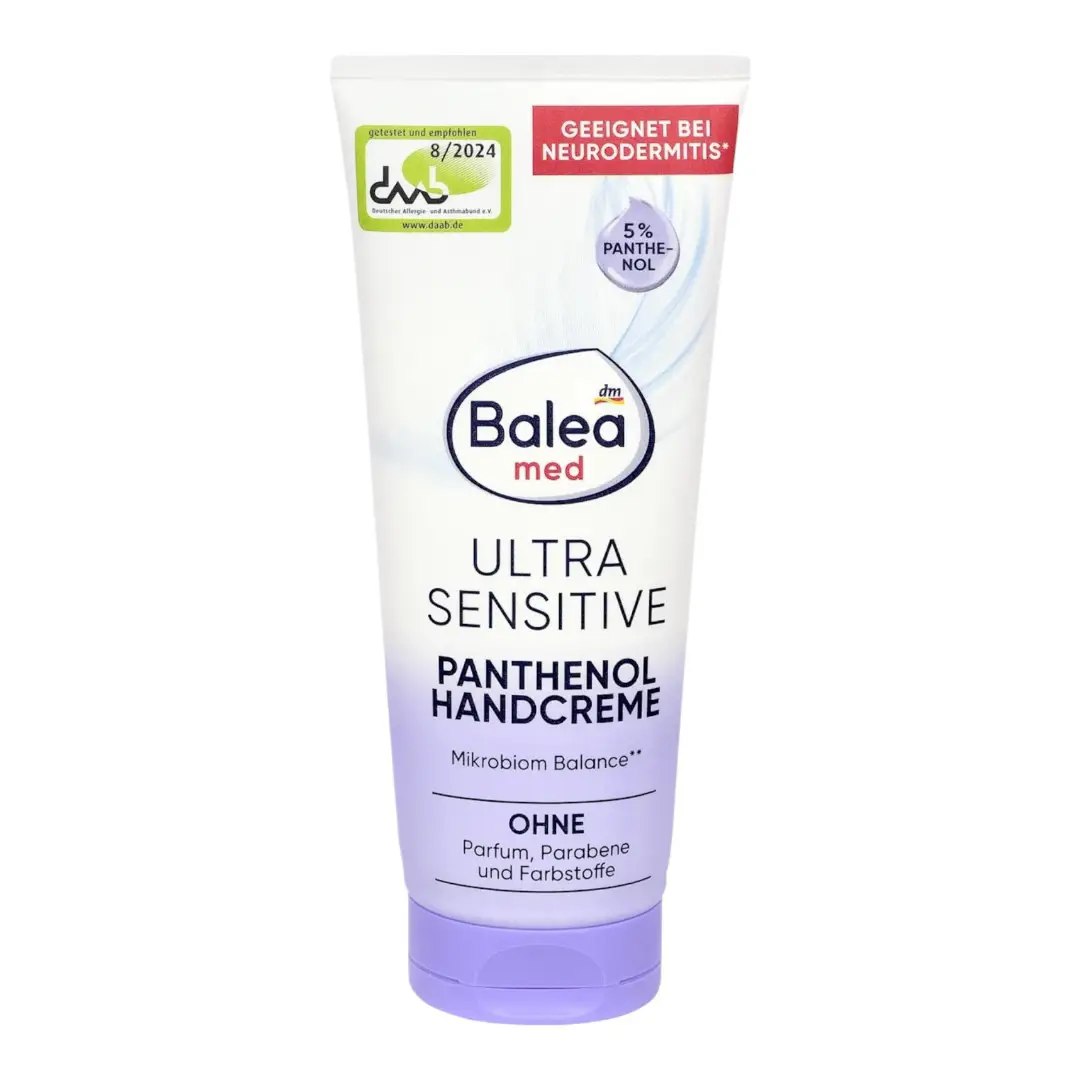 Крем для рук Ultra Sensitive від Balea med – це ніжний догляд для подразненої шкіри. Завдяки ретельно підібраним поживним інгредієнтам, таким як гліцерин, пантенол та алантоїн, він забезпечує інтенсивне полегшення та заспокоює суху, подразнену шкіру рук. Ця формула не тільки полегшує свербіж, спричинений сухістю, але й підходить для базового догляду за нейродермітом. Підтримуючи баланс шкірної флори, крем для рук сприяє підтримці цілісного шкірного бар'єру і таким чином забезпечує помітно приємне відчуття на шкірі. Справжня насолода для рук, якими користуються щодня.