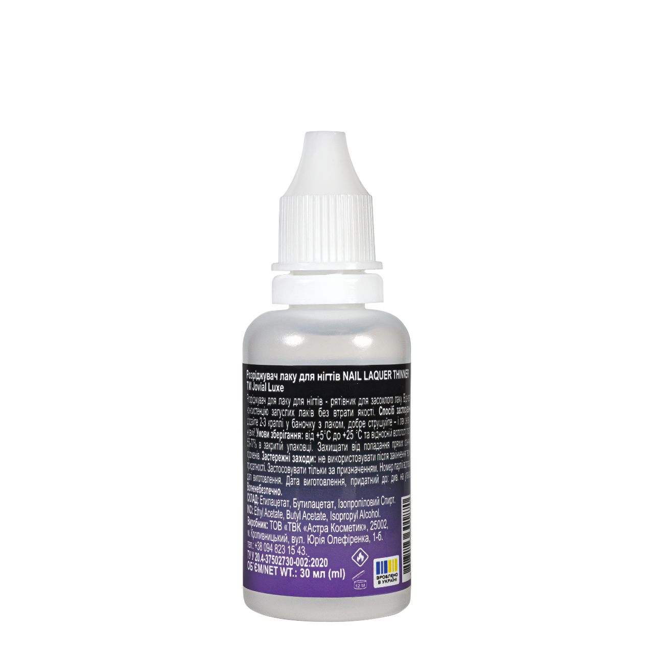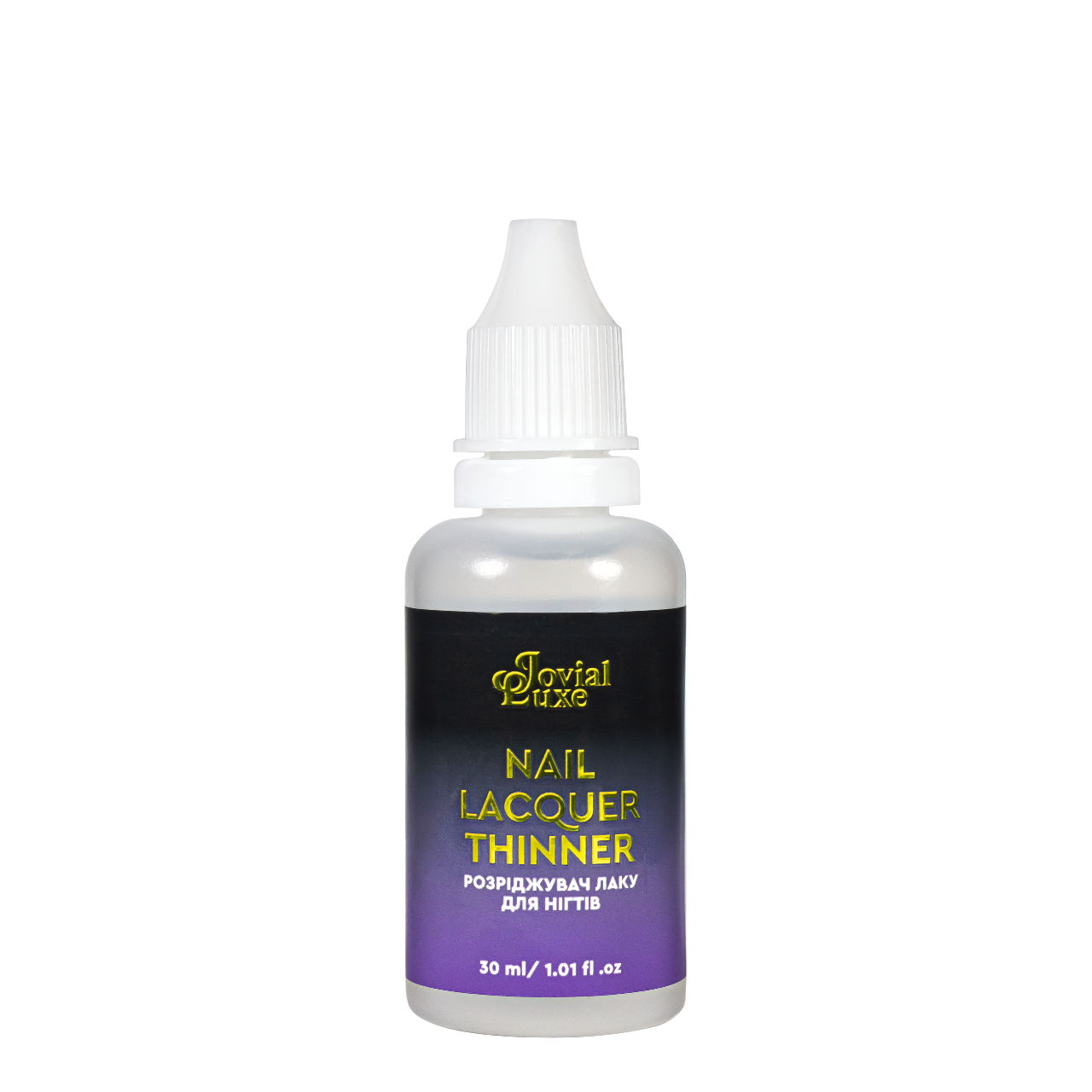 Рідина для розведення лаку для нігтів Jovial Luxe Nail Laquer Thinner, 30 млДумаєте, чим і як зробити загуслий лак для нігтів рідкішим? Лише кілька крапель розріджувача засохлого лаку допоможуть вам повернути йому потрібну консистенцію без втрати якості та кольору. Завдяки цьому засобу ви зможете використовувати кожен флакончик до останньої краплі! Розчинник економно витрачається, тому ви зможете врятувати ним не одну пляшечку декоративного лаку для нігтів.Як користуватися:Додайте 2-3 краплі рідини для розведення в лак і гарненько струсіть флакон.Об'єм: 30 мл