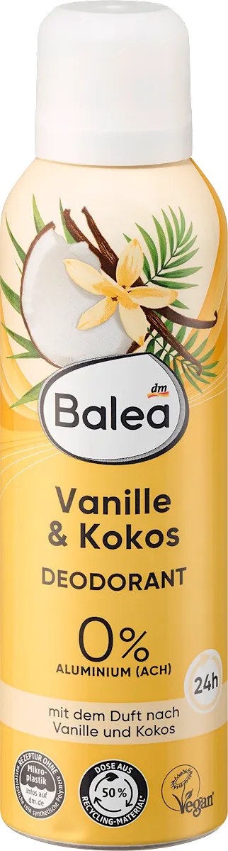 З дезодорантом Balea Vanilla & Coconut ваш день розпочнеться з відтінком літа. Дезодорант поєднує солодкий аромат ванілі з тропічною свіжістю кокоса, створюючи приємний аромат. Захищає від неприємного запаху тіла і дарує тривале відчуття свіжості та чистоти. Ніжна формула дбайливо ставиться до шкіри та не залишає небажаних слідів. Для повного відчуття догляду та аромату, який балує почуття.