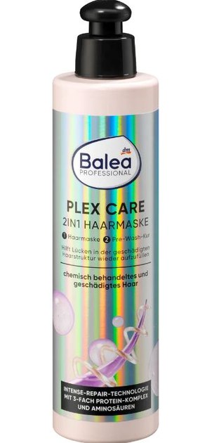 Маска для волосся Balea Professional Plex Care 2in1 з потрійним протеїновим комплексом і амінокислотами зміцнює волосся і відновлює пошкоджену структуру волосся. Розгладжує структуру волосся та зменшує пошкодження волосся, викликане посіченими кінчиками та ламкістю. Інтенсивний глибокий догляд забезпечує зміцнення волокон волосся та легкість розчісування. Для зміцнення волокон волосся та здорового блиску.