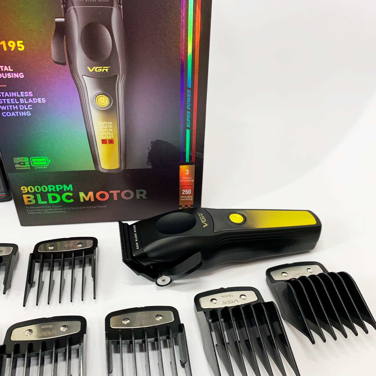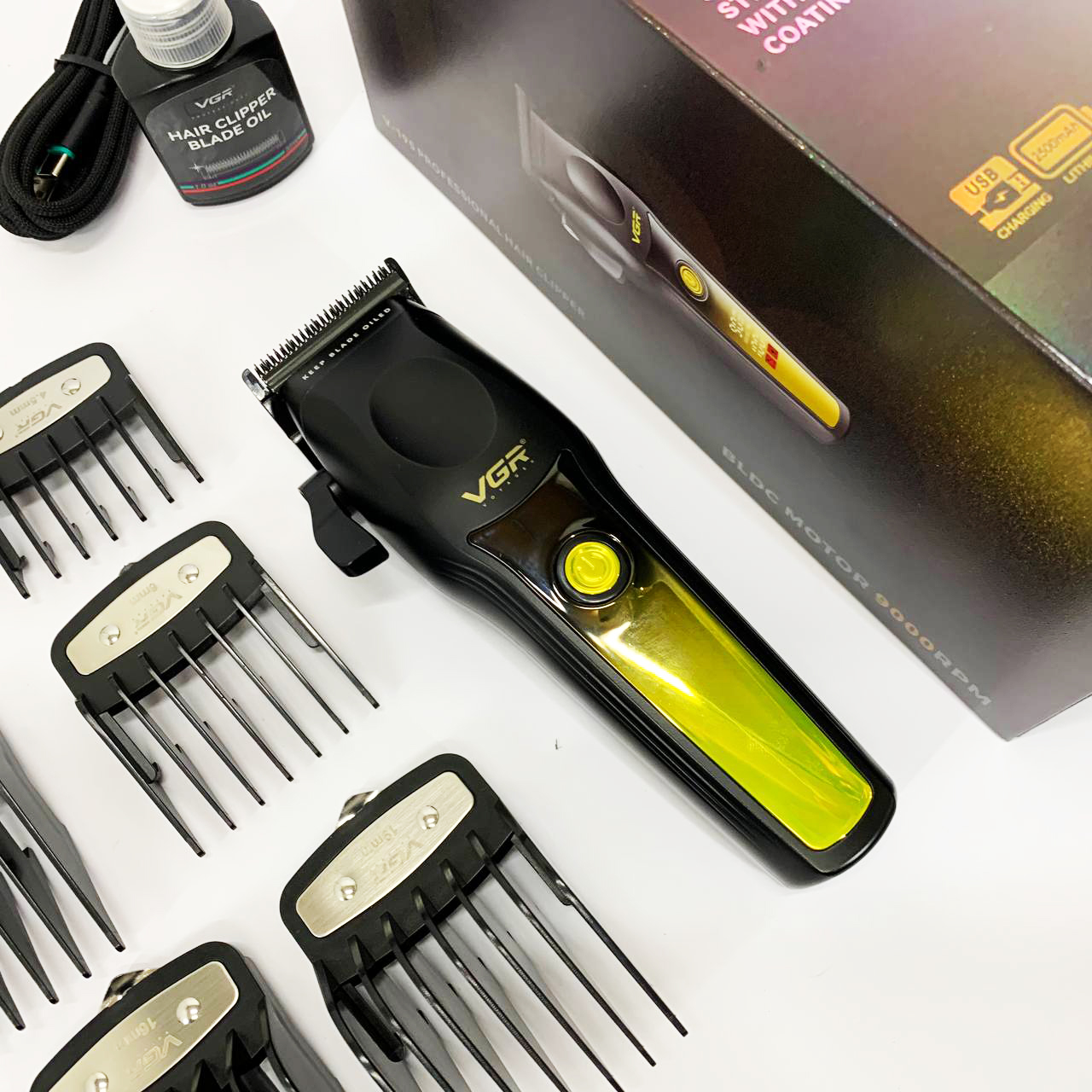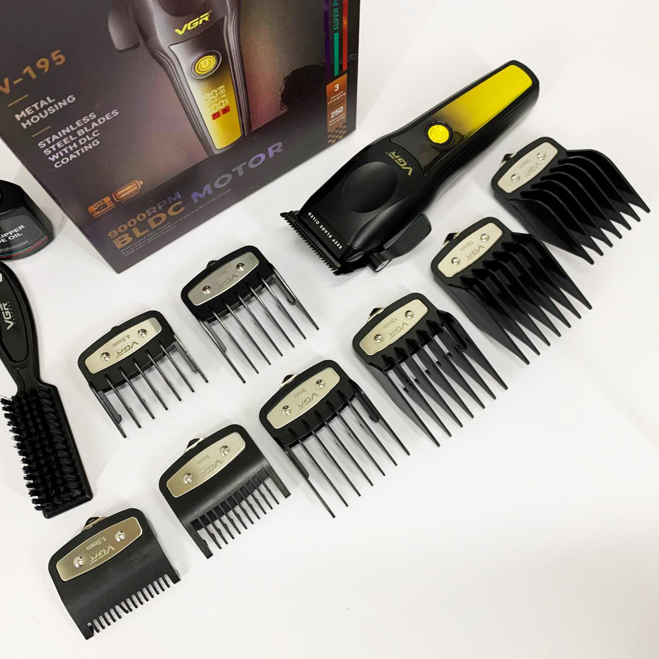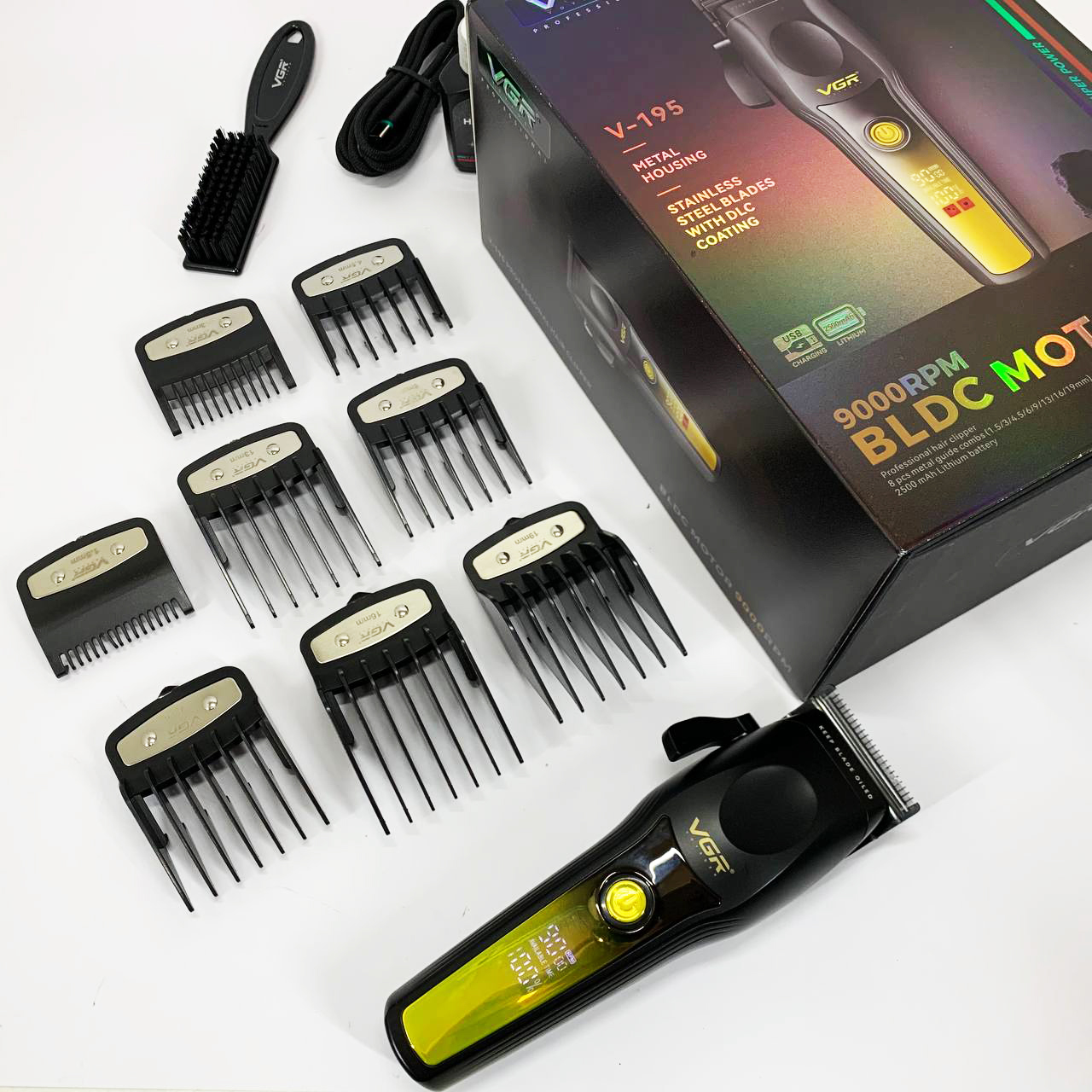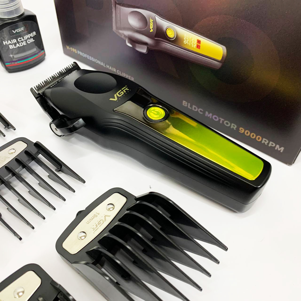 В комплект входят 8 съёмных насадок, позволяющих точно регулировать длину среза для создания различных стилей — от аккуратной окантовки до полноценной стрижки. Интуитивно понятный LED-дисплей информирует о текущем уровне заряда, необходимости смазки, режиме работы и состоянии зарядки. Беспроводной формат обеспечивает свободу движений, а высокая производительность, надёжность и универсальность делают VGR V-195 GREEN отличным выбором как для профессионалов, так и для личного ухода.