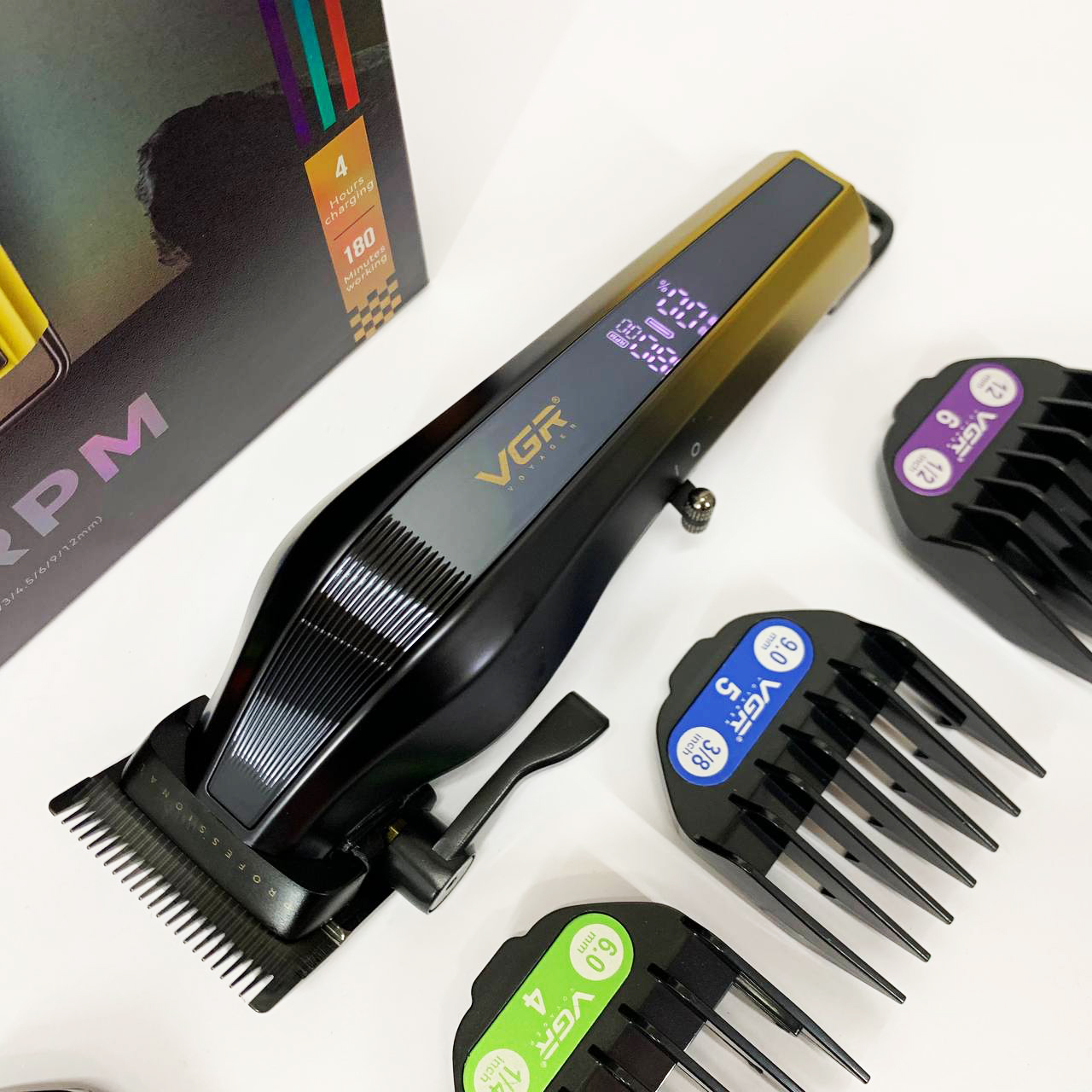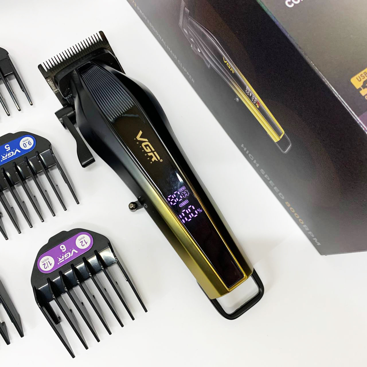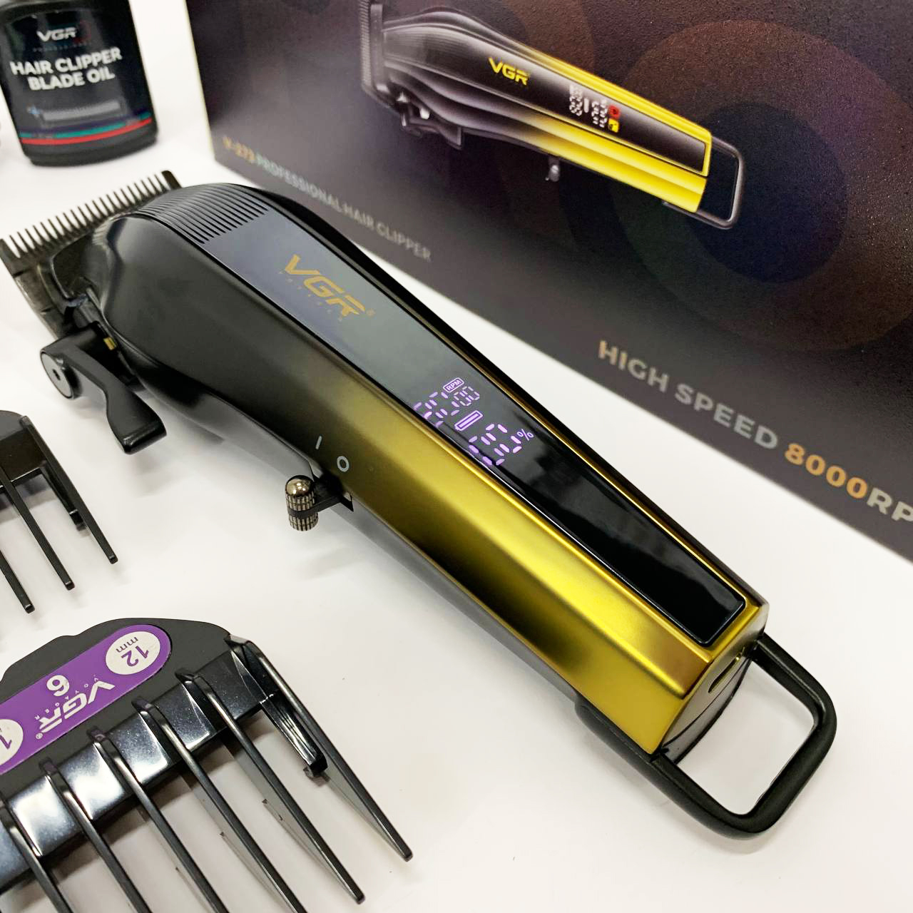 Профессиональная машинка для стрижки волос VGR V-001 с дисплеем 9000 об/мин и 10 насадками. Цвет: золотой