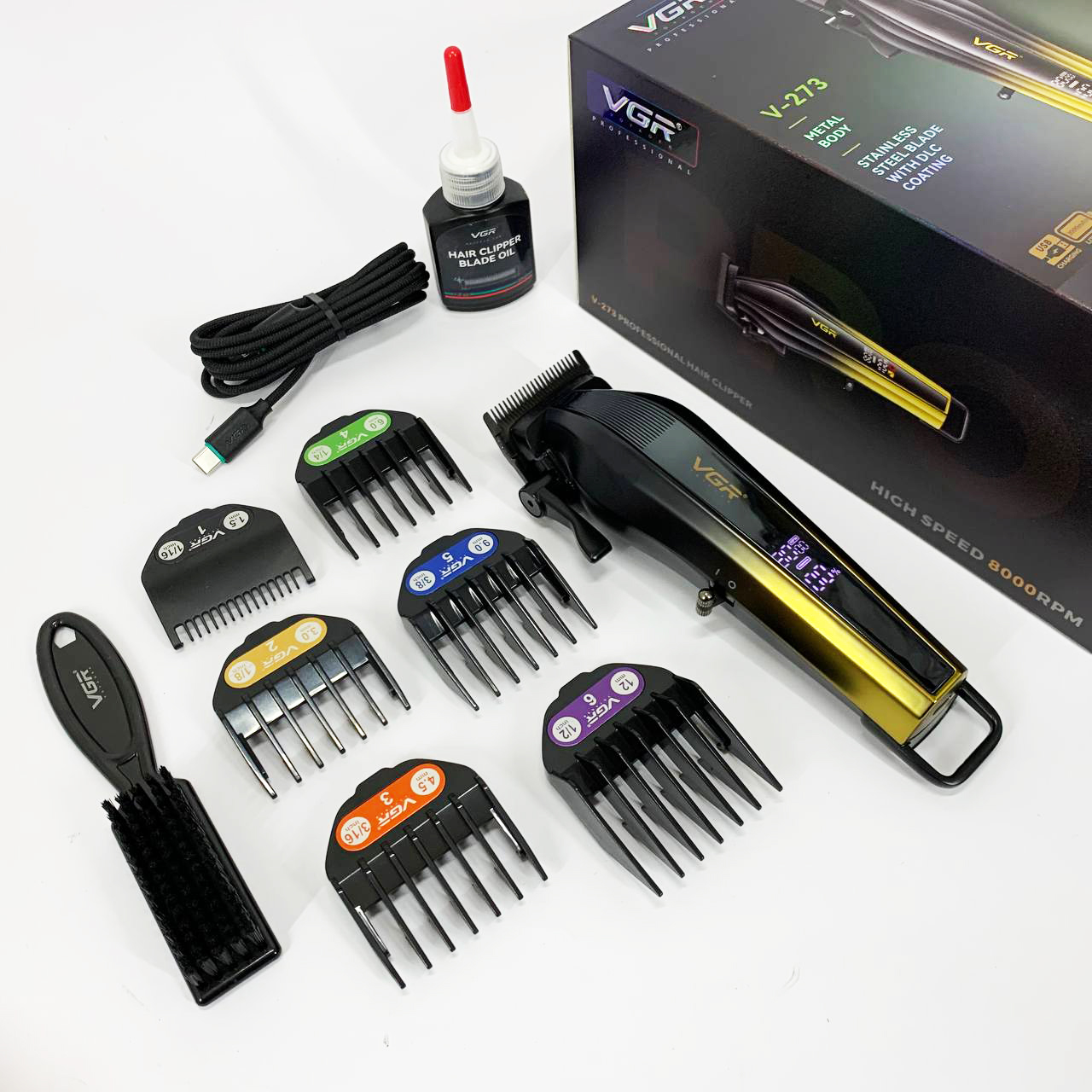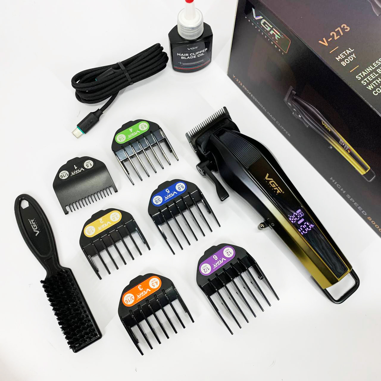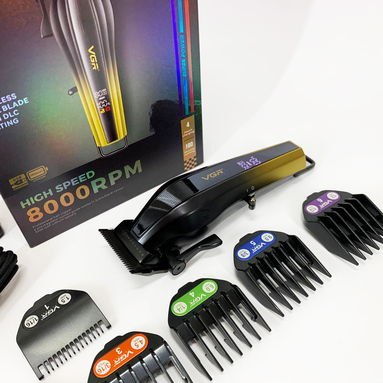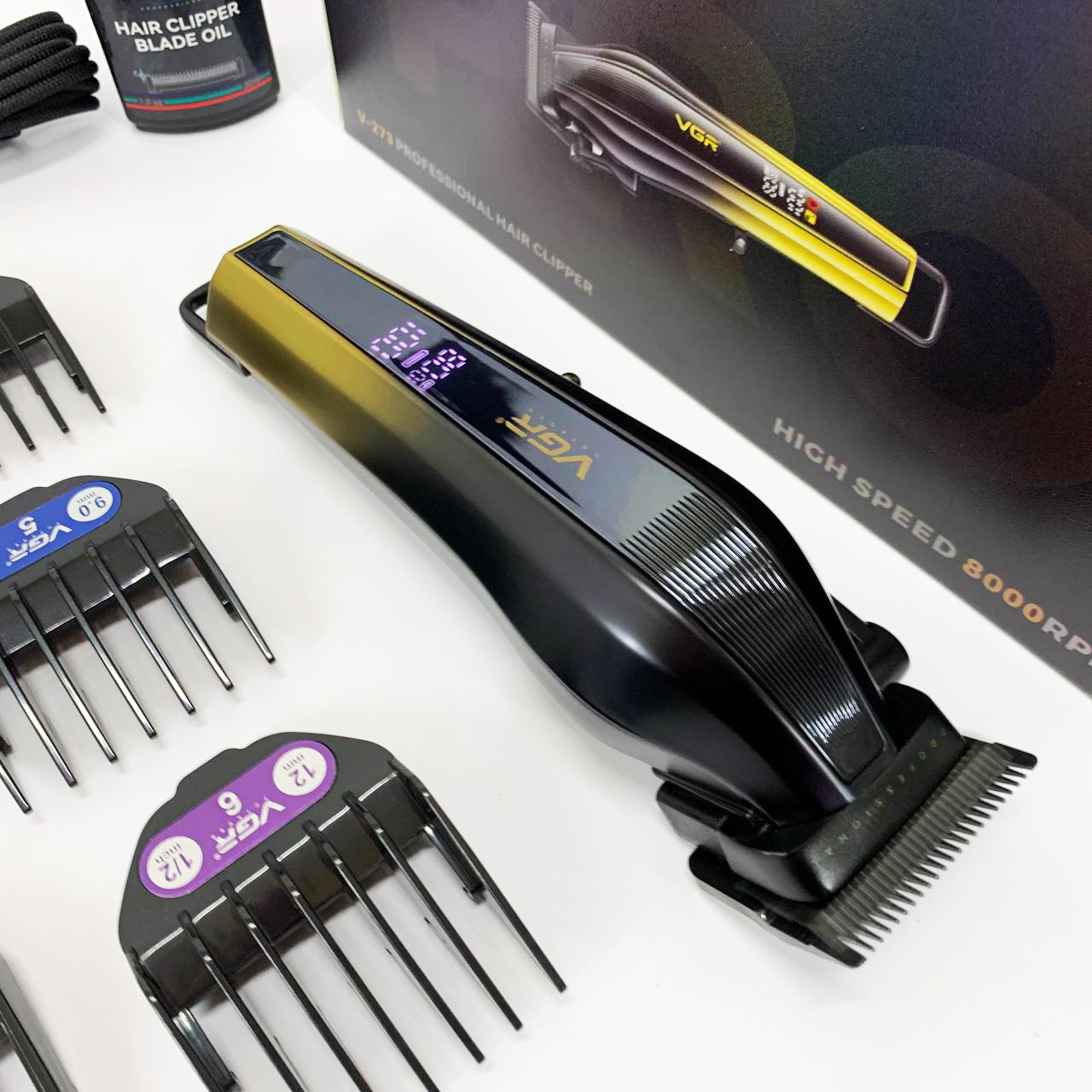 Профессиональная машинка для стрижки волос VGR V-001 с дисплеем 9000 об/мин и 10 насадками. Цвет: золотой