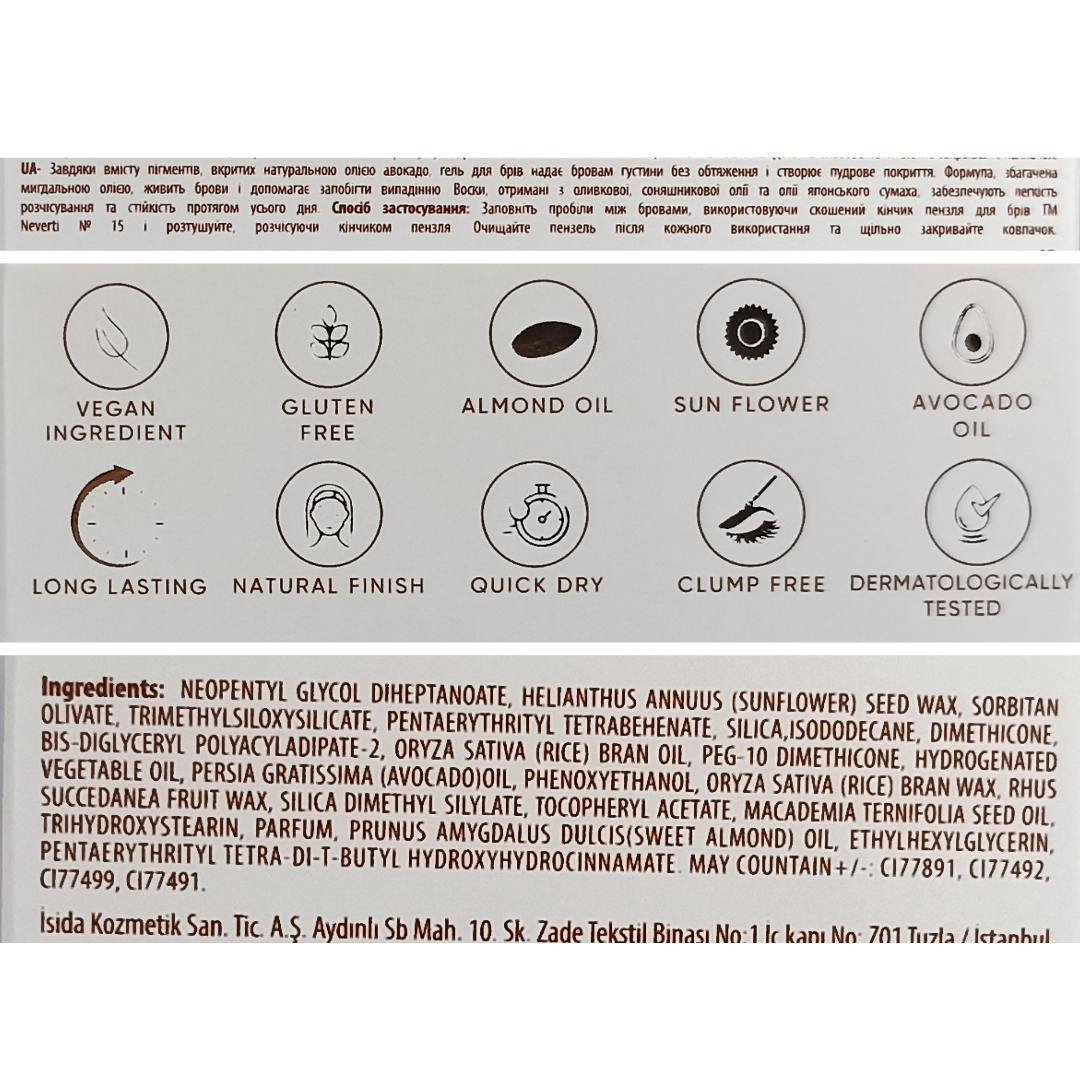 надійно та надовго фіксує; дарує стійкий відтінок.Гель для брів у баночці Neverti NP600 ідеально підходить як для професійного використання, так і домашнього макіяжу. Спробуйте вже сьогодні — і ваші брови завжди матимуть ідеальний вигляд!Як використовувати:Розчешіть брови щіточкою.