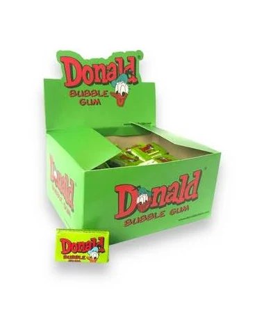Упаковка жувальної гумки Donald Bubble Gum виконана в яскравому, привабливому стилі, що привертає увагу з першого погляду. Кожна гумка запакована в індивідуальну обгортку з зображенням улюблених персонажів, що створює додаткову радість і для дітей, і для дорослих. Такий дизайн робить жуйки не тільки смачними, але й візуально привабливими.