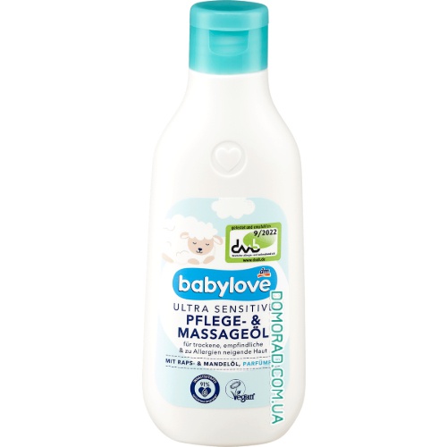 Олія для догляду та масажу Babylove Ultra Sensitive Care and Massage Oil з ріпаковою та мигдалевою олією ідеально підходить для ніжного догляду за дитиною або ніжного масажу. Ця концепція догляду 3-в-1 з натуральними оліями поєднує в собі надзвичайно м’яке очищення, інтенсивний догляд та ніжний масаж – особливо для сухої та особливо чутливої ​​шкіри немовлят. Вона ідеально підходить для ніжного очищення зони під підгузками та для дитячого масажу. Вона підтримує захисні функції шкіри, сприяє її регенерації та робить її м’якою та еластичною.