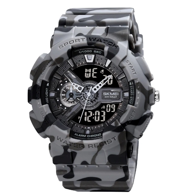 Часы SKMEI 1688CMGY — это стильный и надежный аксессуар для тех, кто ведет активный образ жизни и выбирает смелый дизайн. Его корпус и ремешок выполнены в серой камуфляжной расцветке, идеально подходящей для военного стиля или outdoor-активностей. Комбинированный аналогово-цифровой дисплей позволяет быстро и удобно считывать информацию, а LED-подсветка обеспечивает отличную видимость в темноте.