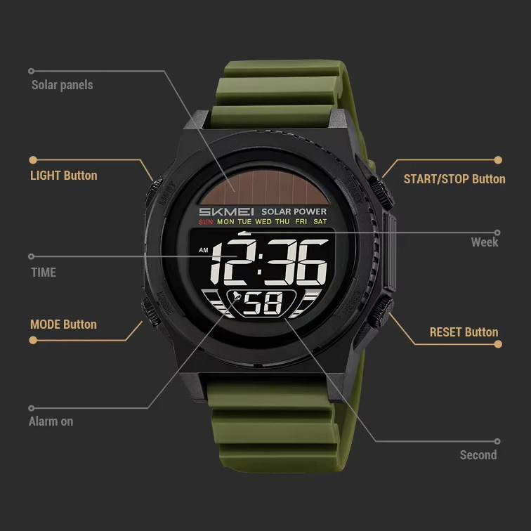 Часы SKMEI 2358AG — это современный аксессуар для активного образа жизни, сочетающий в себе надежность, функциональность и стильный дизайн. Благодаря прочному корпусу, электронному дисплею с подсветкой и солнечному питанию модель идеально подходит для ежедневного использования как в городе, так и на природе.