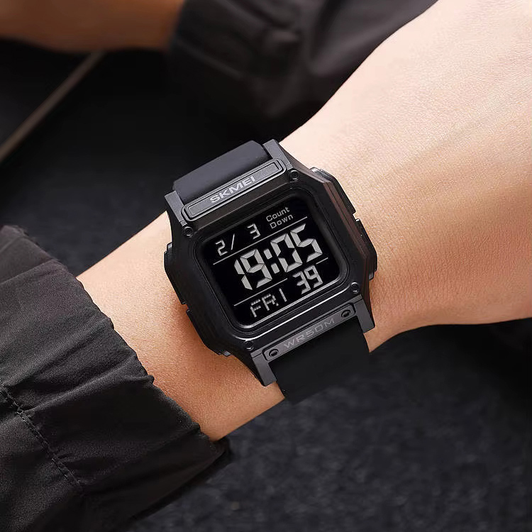 Черный матовый корпус с четкими линиями и ремешок в тон придают часам строгий и сдержанный вид. Контрастный цифровой экран с большими цифрами обеспечивает отличную видимость, а квадратная форма корпуса добавляет нотку ретро-дизайна в современной интерпретации. Модель подходит как для активного дня, так и для офисного стиля.