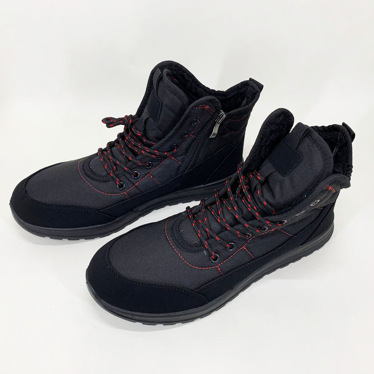 Стильные мужские ботинки на осень и зиму — это практичная обувь с утеплением, которая идеально подходит для ежедневного использования в холодное время года. Они изготовлены из прочного текстиля со вставками из искусственной замши, имеют высокий верх и шнуровку для плотной посадки на ноге. Красная контрастная строчка придает модели выразительности и современный вид.