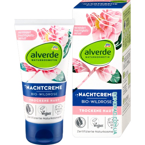 Нічний крем «Дика троянда» від alverde Naturkosmetik – це формула догляду, спеціально розроблена для інтенсивного відновлення шкіри протягом ночі. Завдяки цінним оліям дикої троянди, соняшнику, авокадо та оливи, він забезпечує шкіру необхідними поживними речовинами та забезпечує відновлювальний ефект, який залишає шкіру сяючою наступного ранку. Органічна гіалуронова кислота та комплекс натуральних активних вуглеводів підтримують регуляцію вологості та сприяють гладкості шкіри.