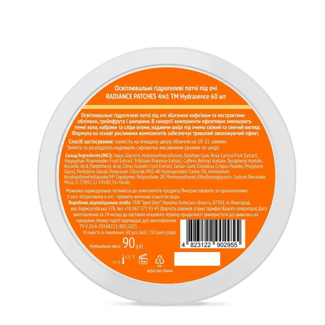 Освітлювальні патчі для шкіри навколо очей Hydrasence з кофеїном і екстрактом обліпихи, грейпфрута, шипшиниОсвітлювальні гідрогелеві патчі 4 в 1 сприяють зменшенню набряків і ознак втоми, усувають темні круги в зоні навколо очей, надають шкірі відпочилого та свіжого вигляду.Патчі містять унікальну сироватку, що поєднує активні компоненти для природного сяйва шкіри — кофеїн, екстракти обліпихи, грейпфрута та шипшини. Засіб розроблений для шкіри, схильної до пігментації та тьмяності. Ідеальний помічник, коли потрібно швидко освіжити шкіру навколо очей.Активні компоненти:екстракт обліпихи — допомагає просвітлити шкіру та захистити її від впливу довкілля;