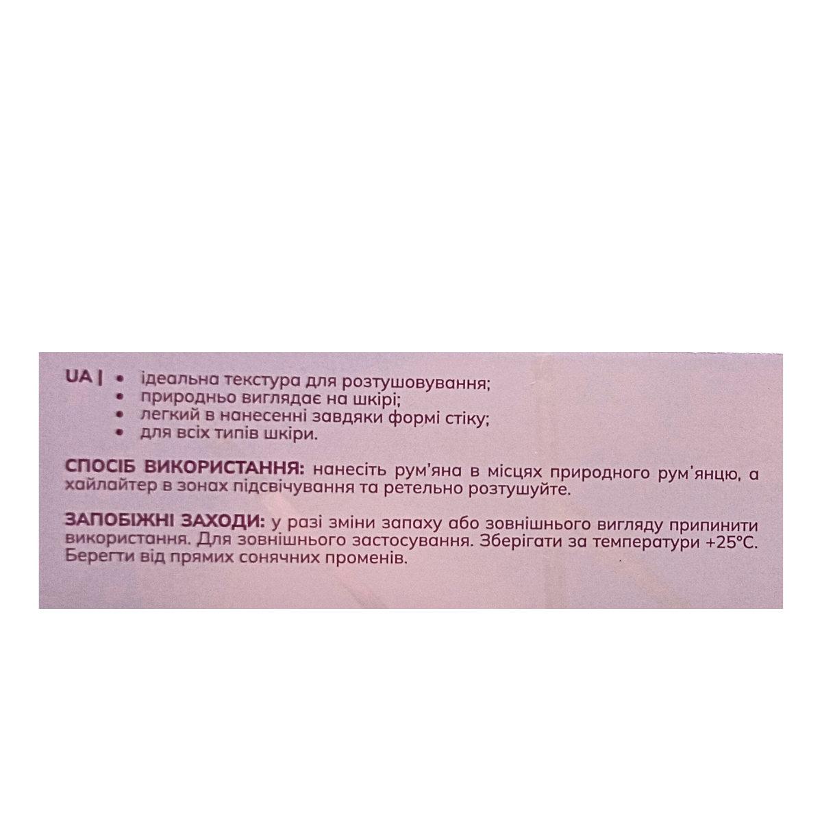 компактна форма — ідеально для косметички або подорожей.Кому підходитьГібрид рум'ян і хайлайтера сподобається всім, хто цінує швидкий і зручний макіяж із природним сяйним ефектом. Ідеальний для щоденного використання або створення ніжного вечірнього образу.Переваги:можливість створювати сяйний макіяж у будь-яких умовах;