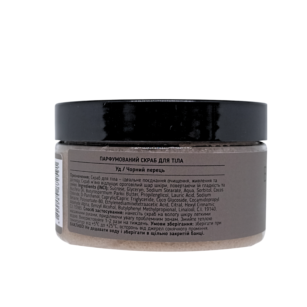 залишає на тілі благородний аромат уда з нотами чорного перцю.Кому підходить:Скраб для тіла завдяки своєму деревно-пряному аромату підійде як чоловікам, так і жінкам. Поєднується з усіма типами шкіри.Скраб прикрасить ваш ритуал очищення шкіри в лазні, сауні. Він наповнить приміщення розкішним ароматом східних прянощів і деревини, створюючи атмосферу умиротворення й розслаблення.Спосіб застосуванняНанесіть ароматний цукровий скраб на вологу шкіру.