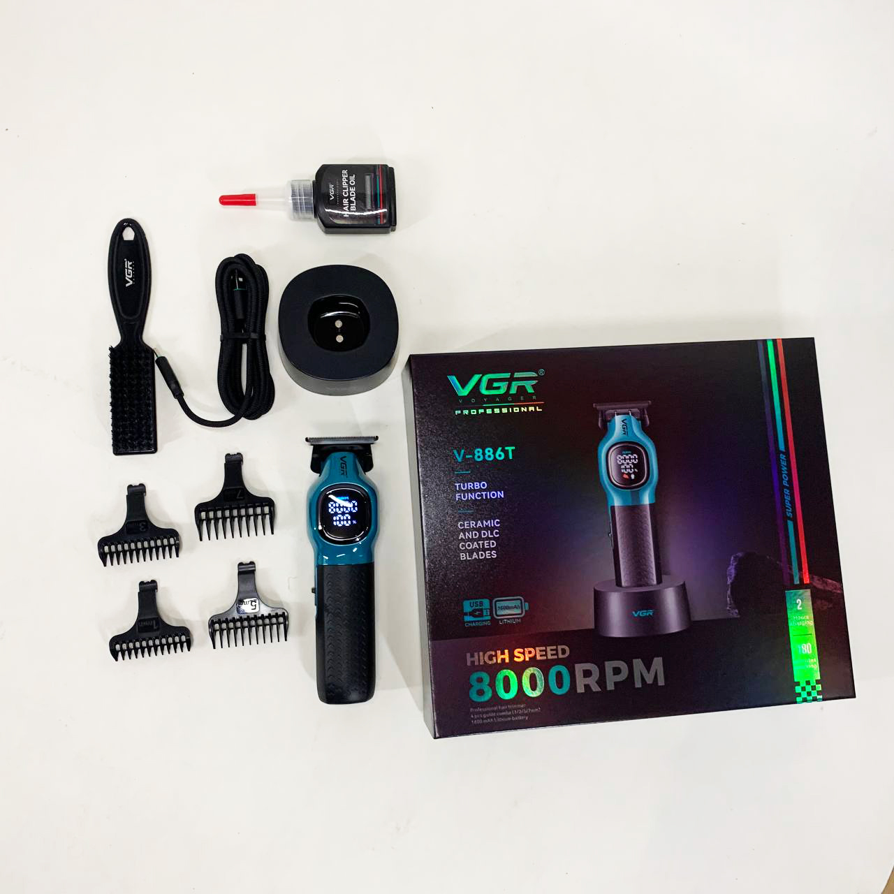 Триммер VGR V886T– профессиональная машинка для точной стрижки и моделирования. Высокоскоростной мотор 8000 об/мин и керамическое лезвие из металла обеспечивают плавный и стабильный срез. Литиевая батарея 1600 мА·ч работает до 200 минут, LED-дисплей отображает обороты, заряд и индикатор смазки. USB-зарядка и зарядная база делают устройство удобным как для дома, так и для салона. В комплект входят четыре насадки 1, 3, 5, 7 мм для разных техник стрижки.