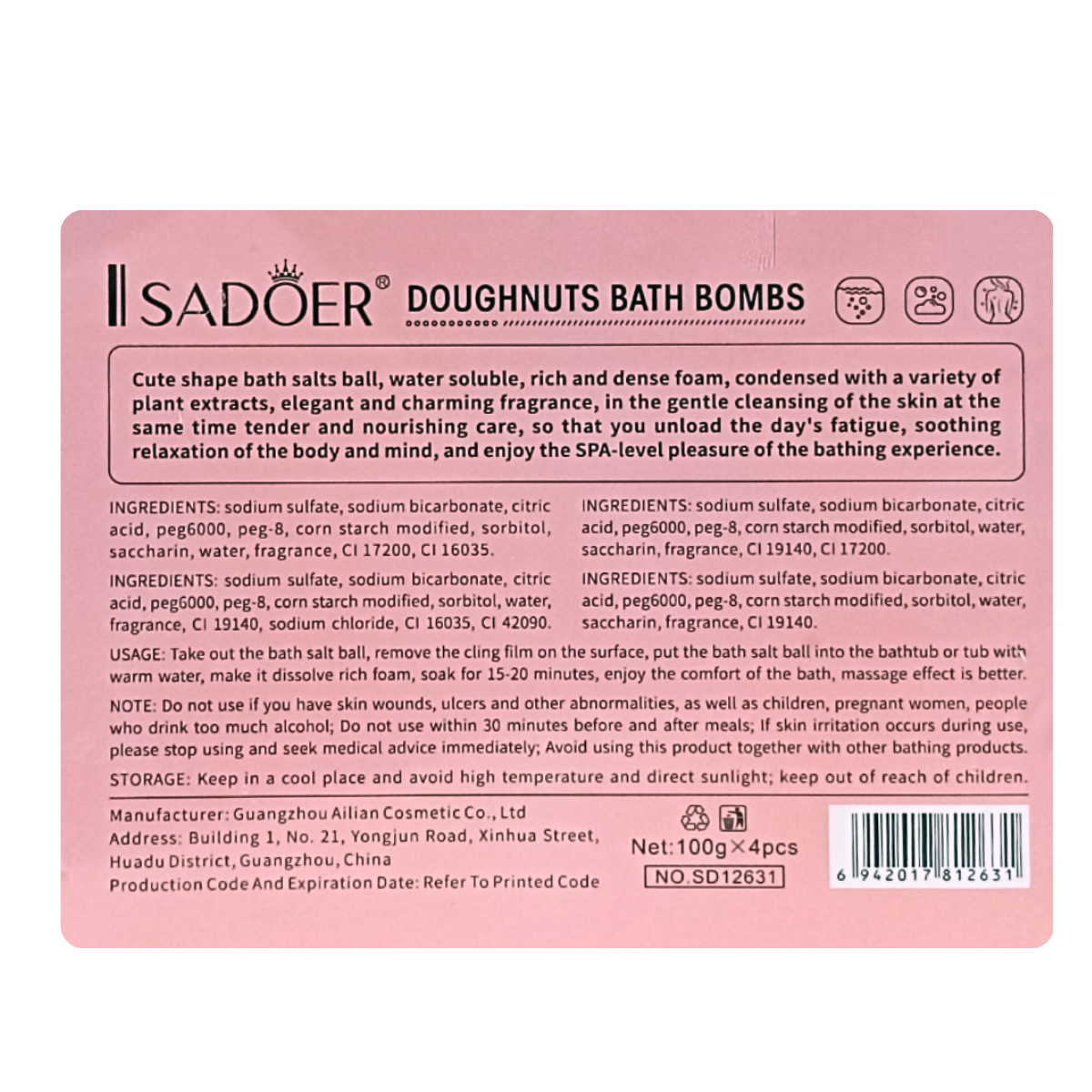 Подарунковий набір пінних бомбочок для ванни Sadoer "Донатси", 4 шт. Изображение №2