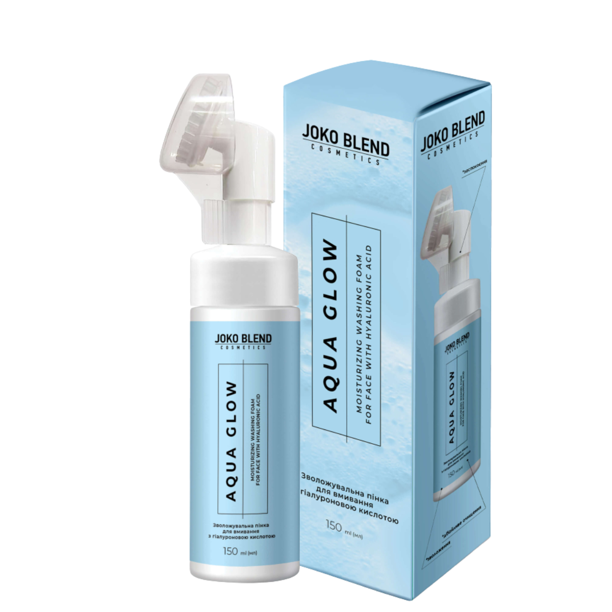 Зволожувальна пінка для вмивання з гіалуроновою кислотою Joko Blend™ для всіх типів шкіриЗволожувальна пінка для вмивання Joko Blend™ Aqua Glow делікатно очищає шкіру від забруднень, надлишків себуму та макіяжу, не порушуючи її природний баланс. Легка повітряна текстура дарує відчуття свіжості, комфорту та зволоження вже з першого використання. Флакон із силіконовою щіточкою робить процес умивання ще більш ефективним.Основні властивостіЯк працює зволожувальна пінка для вмивання:м'яко очищає шкіру без пересушування;