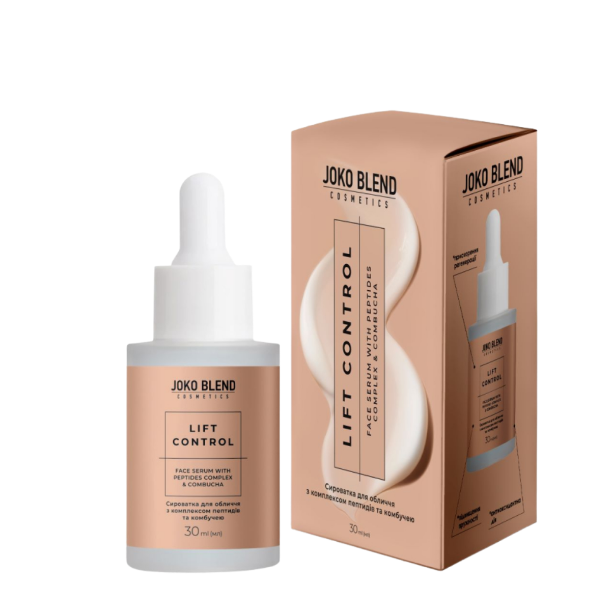 Сироватка для обличчя з пептидним комплексом та комбучею Joko Blend Lift Control, - омолодження, ліфтинг, зволоженняСироватка для обличчя Joko Blend™ Lift Control створена на основі запатентованого комплексу пептидів Replexium® і ферментованого чорного чаю комбуча. Засіб стимулює синтез колагену та еластину, зміцнює шкіру, вирівнює тон і забезпечує помітний омолоджувальний ефект за щоденного використання.Основні властивостіЯк працює:стимулює вироблення колагену та еластину; підвищує пружність і еластичність шкіри; захищає від передчасного старіння; поліпшує текстуру та тон шкіри; підтримує оптимальний рівень зволоження протягом дня.Активні компонентиЯк діють активи засобу:комплекс пептидів Replexium® - стимулює синтез колагену й еластину, зменшує вираженість зморшок і запобігає їхній появі; ферментований чорний чай (комбуча) - потужний антиоксидант, нейтралізує дію вільних радикалів, покращує тон і надає шкірі природного сяйва; гіалуронова кислота - забезпечує глибоку гідратацію та утримання вологи в клітинах шкіри; вітамін Е - захищає від окиснювального стресу, підтримує еластичність і регенерацію шкіри; екстракт ламінарії, д-пантенол та алантоїн - заспокоюють шкіру, зменшують подразнення, мають протизапальну та пом'якшувальну дію;Кому підходитьЦей засіб ідеальний для:шкіри з першими віковими змінами; шкіри, що втратила пружність і тонус; тьмяної та нерівної за тоном шкіри; щоденного антивікового догляду.Ефект від використанняРезультат від регулярного використання серуму з пептидами:більш підтягнута та пружна шкіра обличчя; зменшення вираженості зморшок; гладка текстура та рівний тон обличчя; свіжий, сяючий і доглянутий вигляд.Спосіб використанняНанесіть невелику кількість сироватки на очищену шкіру обличчя. Рівномірно розподіліть легкими рухами по масажних лініях. Використовуйте вранці та ввечері перед нанесенням крему.Об'єм та форма випуску30 мл, флакон з піпеткою