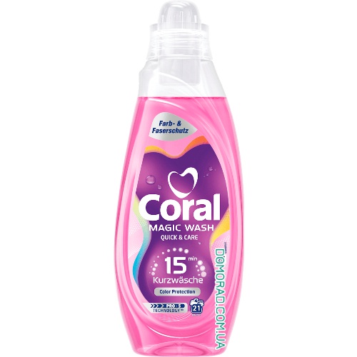 Рідкий засіб для кольорового одягу Coral's Magic Wash – ідеальне рішення для коротких циклів прання. Спеціально розроблений для програм швидкого прання, технологія PRO-S забезпечує швидке та дбайливе прання всього за 15 хвилин. Формула з кондиціонуючими ферментами дбайливо доглядає за кольорами та волокнами вашого одягу. Використовуючи лише 40 мл на одне прання, цей засіб забезпечує ефективне прання та достатньо для 21 завантаження. Цей рідкий засіб ідеально підходить для тих, хто хоче швидко та ретельно випрати свою білизну.