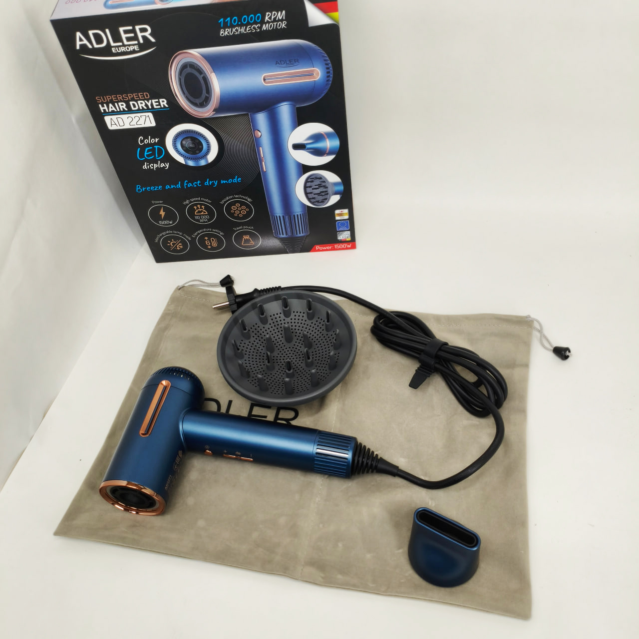 Фен имеет 3 уровня мощности обдува и 6 температурных режимов, что позволяет вам настроить его в соответствии с вашими индивидуальными потребностями. Кроме того, три режима работы (переменная температура, бриз, быстрая сушка) обеспечивают универсальное использование устройства. Фен Adler AD 2271 выделяется на рынке благодаря исключительно высокой скорости воздушного потока — до 18 м/с.