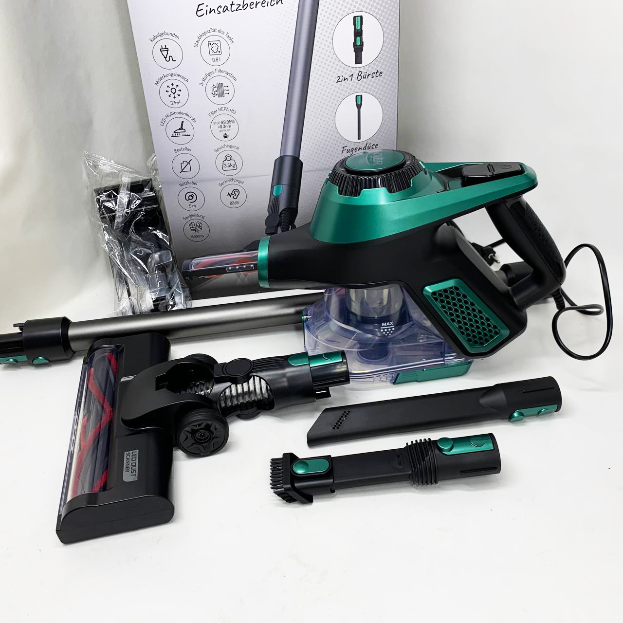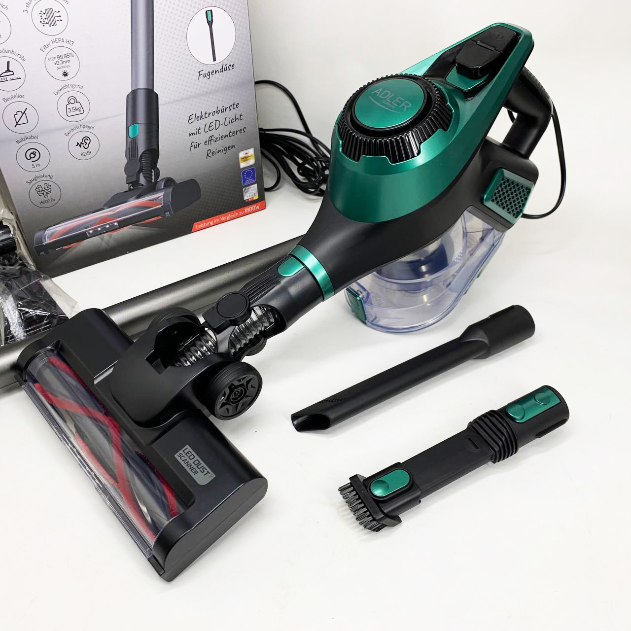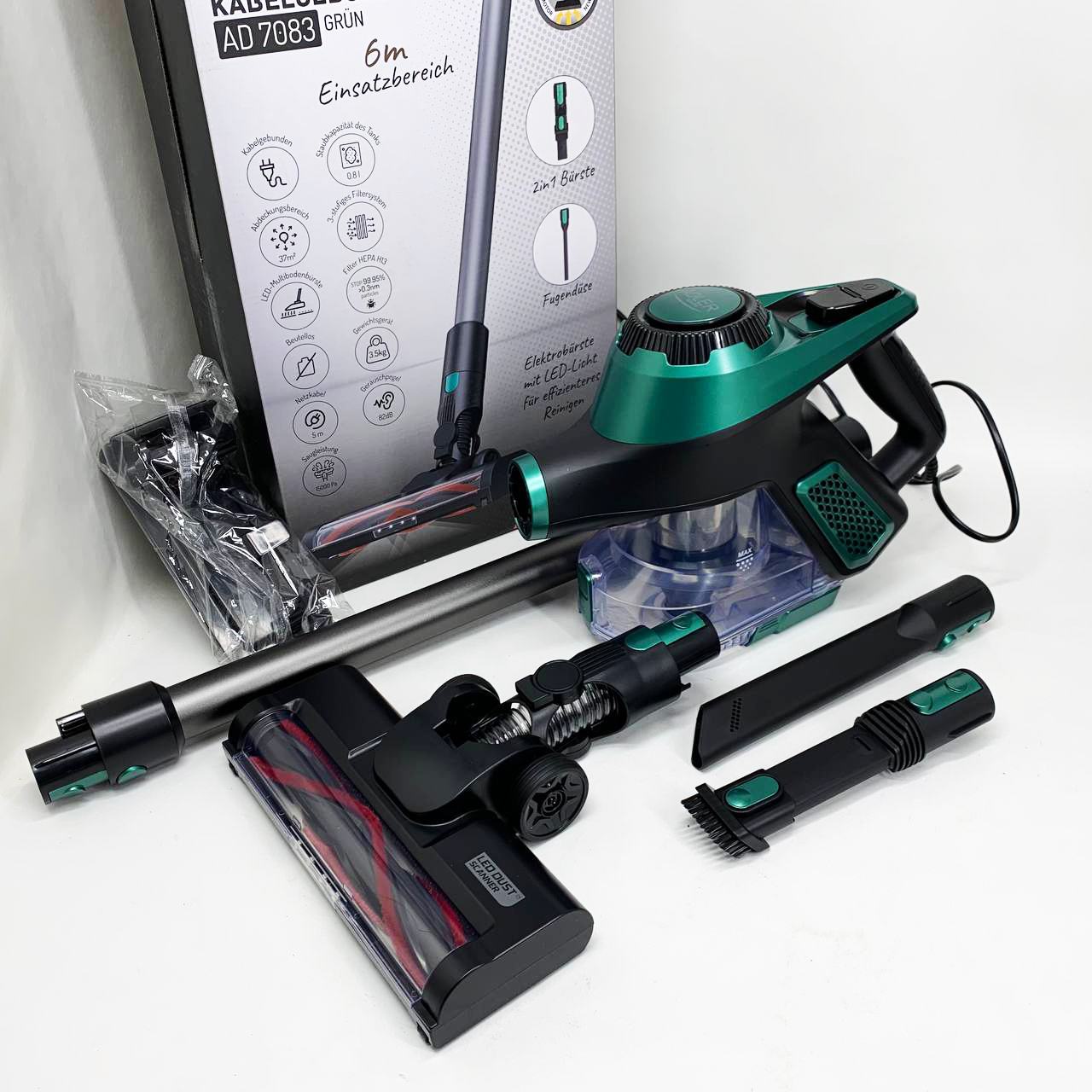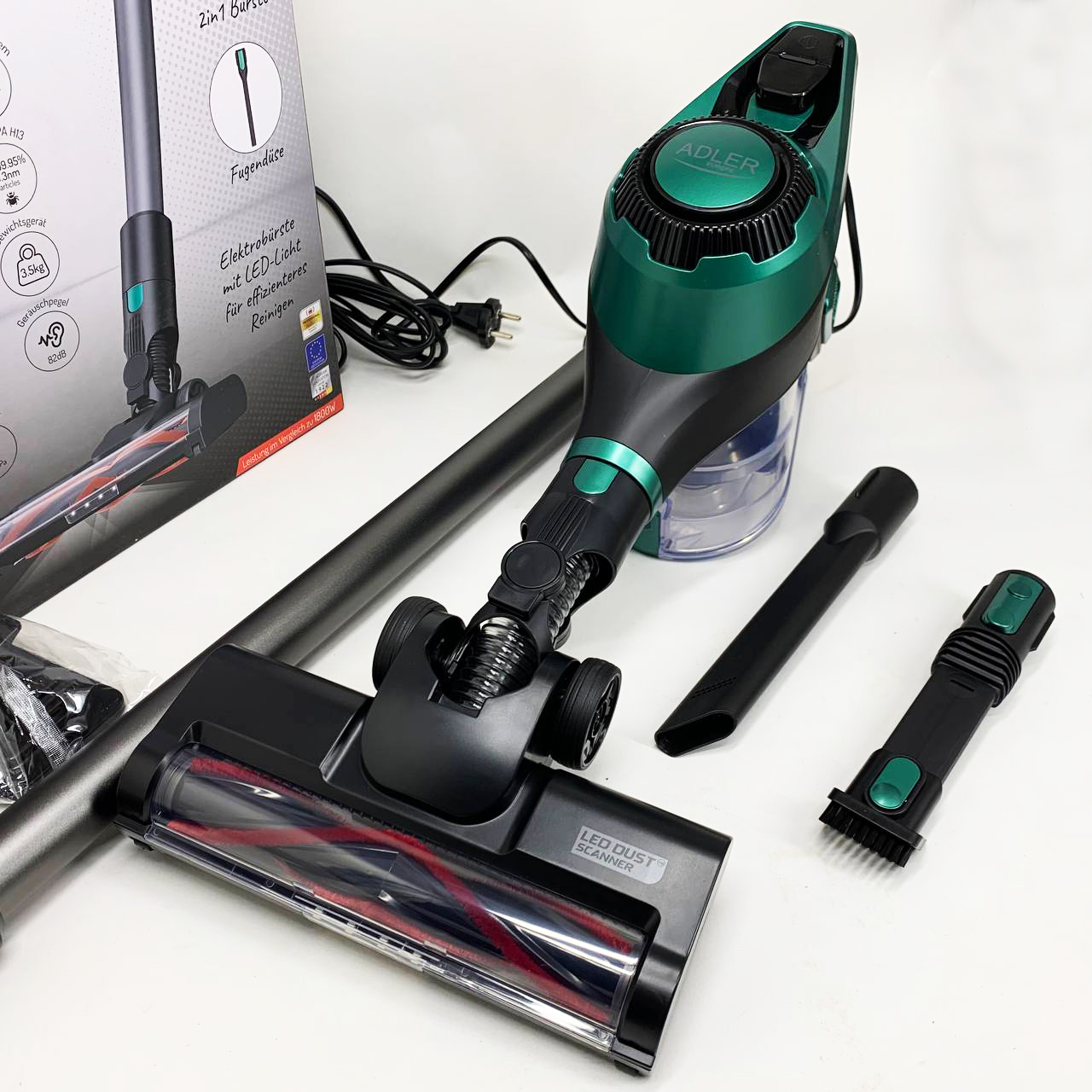 Adler AD 7083 — это современный вертикальный пылесос с мощностью 700 Вт и силой всасывания 15 000 Па, объединяющий высокую производительность, удобство и стильный дизайн. Благодаря моторизованной щетке с LED-подсветкой, трёхуровневой системе фильтрацииHEPA 13 и легкой очистке контейнера, он станет вашим незаменимым помощником для ежедневной уборки дома.