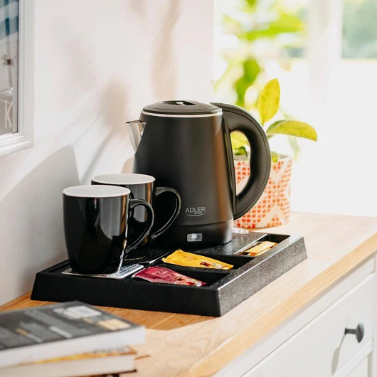 Удобный набор для гостиниц, апартаментов и гостевых комнат. Включает металлический чайник с двойной стенкой и прочную влагостойкую подставку с отделениями для напитков. Практичное решение, позволяющее гостям быстро приготовить горячие напитки без лишних действий.